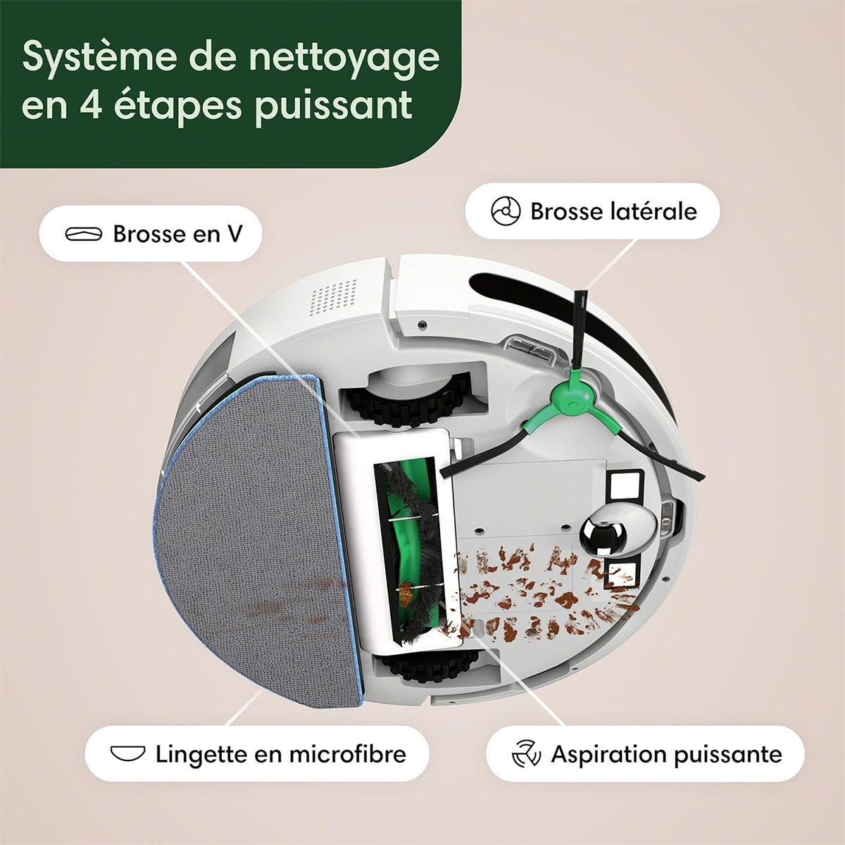 Nettoyez plus facilement grâce au nettoyage en quatre étapes qui inclut trois niveaux d'aspiration puissante, une brosse en V, une brosse latérale et une étape de lavage.