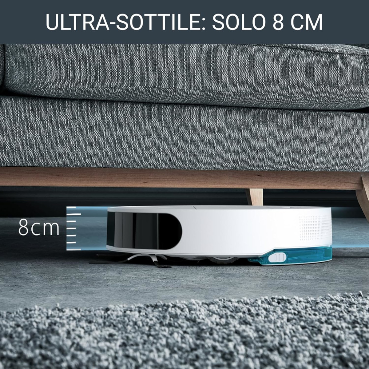 DESIGN ULTRA-FIN : Technologie laser sans tourelle pour un aspirateur robot XS de seulement 8 cm de haut, qui se faufile sous les meubles les plus bas avec une navigation en lignes droites et intelligente
