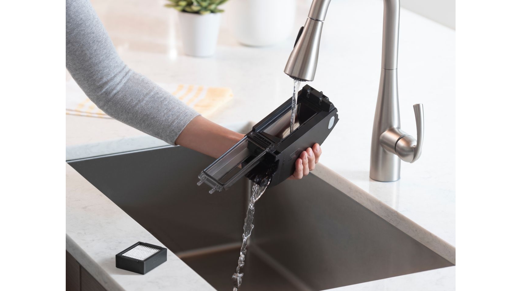 Le Roomba e6198 dispose également d'un filtre haute efficacité qui capture 99 % des allergènes de chat et de chien. Et grâce à son bac à poussière lavable, il n'a jamais été aussi facile de garder votre aspirateur robot Roomba® propre !