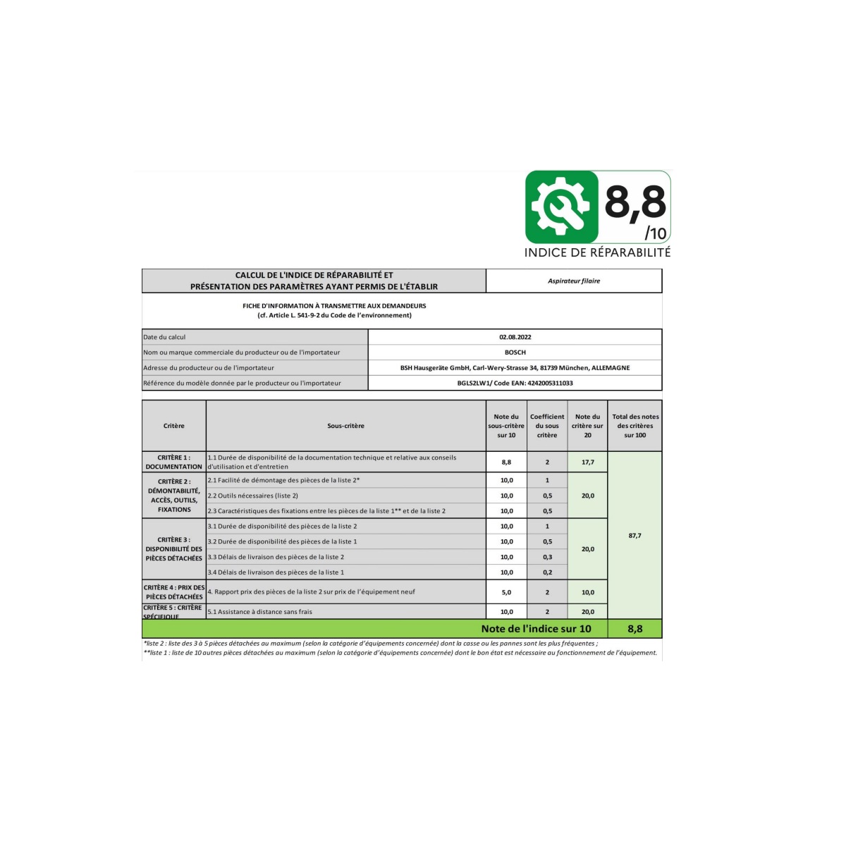 | Libellé | Aspirateur sac Bosch Serie 2 BGLS2LW1 |