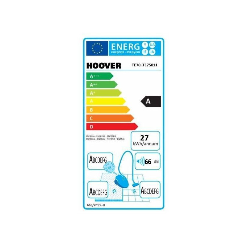 Classe d'efficacité énergétique : A - Consommation annuelle indicative d'énergie 27kWh - Classe de performance de nettoyage sur tapis : A - Classe de performance de nettoyage sur sols durs : A - Classe d'émission de poussiere : A - Niveau sonore : 66 dB(A) - Puissance nominale a l'entrée : 700 W - 66 dBA - Capacité : 3,2 L