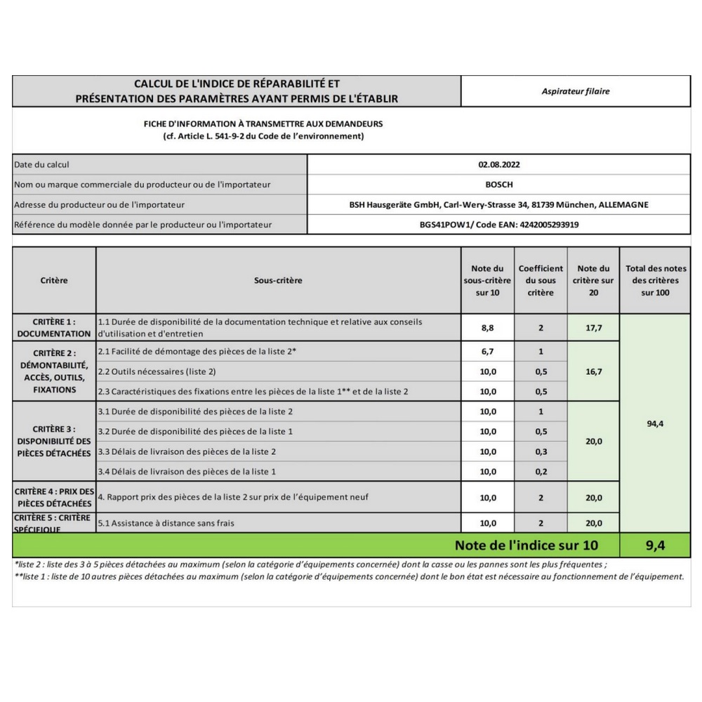 BGS41POW1 - aspirateur sans sac 700w 72db noir - Aspirateur sans sac Série 6 Bosch BGS41POW1. Moteur garanti 10 ans, conçu et développé par Bosch en Allemagne pour une haute performance d'aspiration. Système QuattroPower pour une performance exceptionnelle associée à une faible consommation d'énergie. Technologie SmartSensor pour un contrôle permanent de la performance basé sur des capteurs et indicateur LED. Vidage facile et entretien réduit au minimum du bac à poussières. Filtre hygiénique HEPA lavable : recommandé pour les personnes souffrant d'allergies. Aucun frais ultérieur.