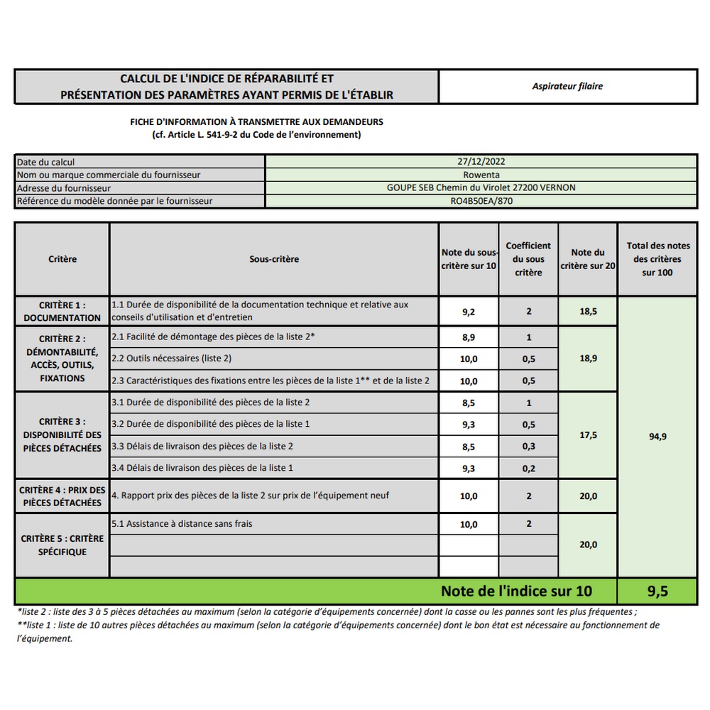 Indice de réparation : 9,5.