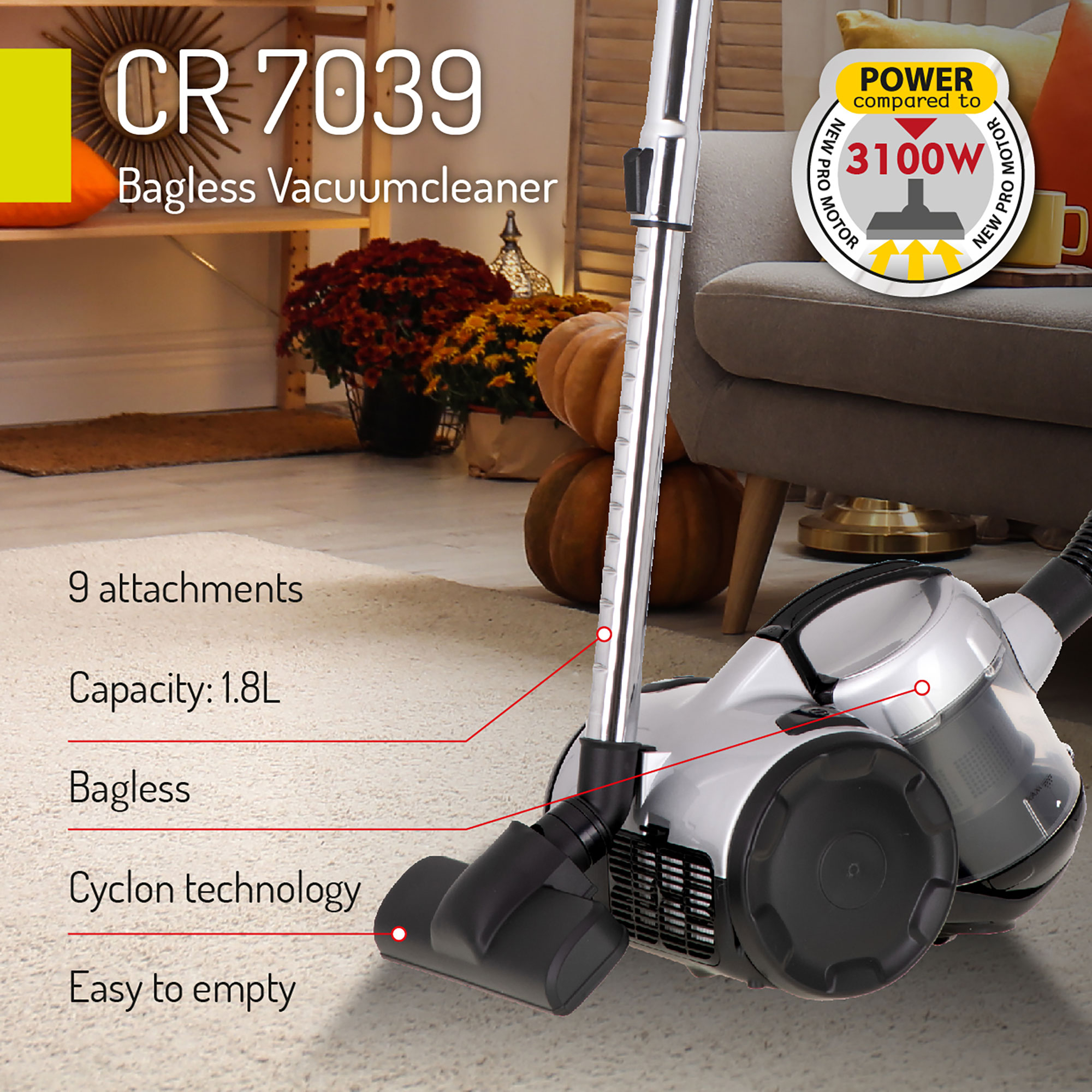 L'aspirateur sans sac CR 7039 est un aspirateur de haute qualité équipé d'un moteur moderne d'une puissance maximale de 3100 W. L'ensemble comprend jusqu'à 9 accessoires pour nettoyer les surfaces difficiles d'accès. Vous n'avez pas d'espace pour ranger plusieurs brosses pour différentes surfaces ? Vous n'aimez pas le « sale boulot », c'est à dire changer de sac dans un vieil aspirateur ? Vous n'auriez pas pu mieux frapper !9 superpositions.Capacité : 1,8 L.Sans sac.Portée jusqu'à 7M.Tube télescopique en métal.Technologie cyclonique.Facile à vider.Système de triple filtration :Filtre en plastique approprié pour la saleté grossière.Filtre en matériau (toison) protégeant le moteur et attrapant les petites saletés.Filtre d'échappement avec la filtration la plus élevée pour nettoyer l'air. d'échappement des particules de poussière.Puissance : 700W.Puissance comparable : 3100W.Tension : 220-240V 50/60Hz.