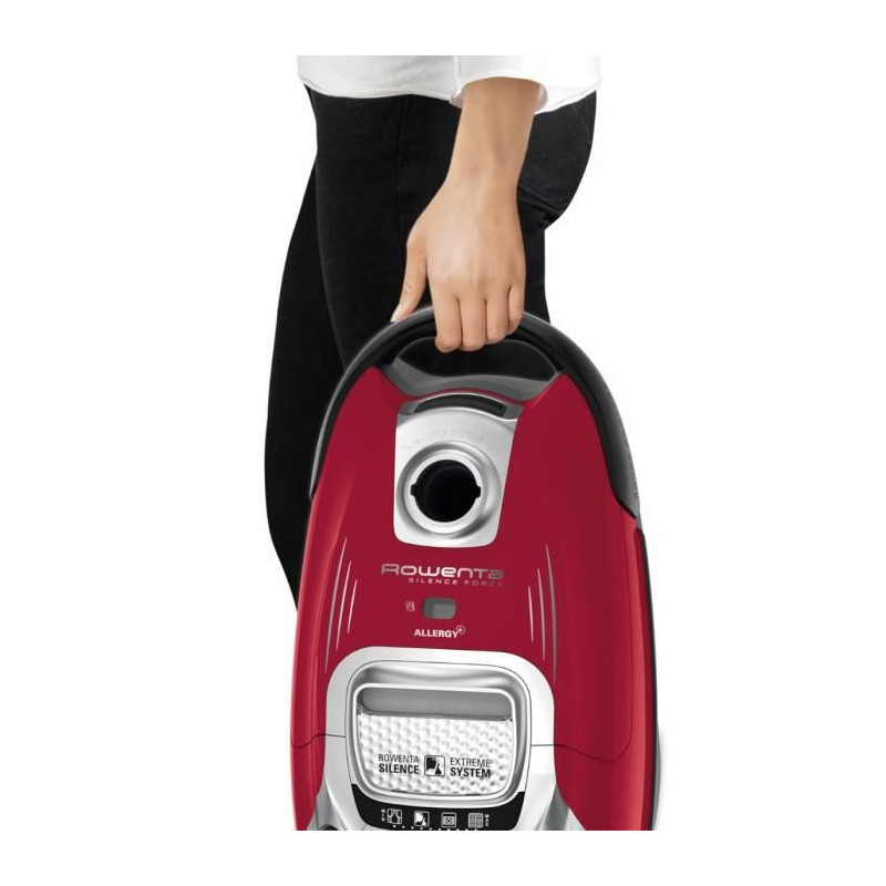 ro7473ea - aspirateur traîneau 400w 58db rouge - Aspirateur traîneau Silence Force Rowenta RO7473EA avec performacne et silence extrême, 5 étoiles. Le premier et le seul aspirateur avec sac qui combine un tel niveau de performance et de silence avec 58 dB(A). La tête d?aspiration POWER AIR garantit des résultats exceptionnels sur tous types de sols, tout en apportant un confort d?utilisation optimal avec sa glisse parfaite. Cet aspirateur offre de puissantes performances, avec 3 niveaux de filtration capturant plus de 99,998 % de la poussière et avec une basse consommation énergétique.Performance de nettoyage ultime, en silence :Découvrez le meilleur de deux mondes : un silence extrême pour un plus grand confort d'utilisation allié à un haut niveau de performance de nettoyage. Les flux d'air optimisés et la tête d'aspiration uniquePower Air lui confèrent des résultats exceptionnels en matière de dépoussiérage sur moquettes et sols durs.Performance anti-allergies :Le système de filtration unique Allergy+ capture 99,98% de la poussière et des allergènes. Les poils d'animaux, les résidus d'acariens et autres particules sont éliminés grâce au filtre haute performance et à l'efficacité su sag Hygiène+. Ces solutions anti-allergiques améliorent la qualité de l'air et assurent un environnement plus sain et hygiénique. Les aspirateurs Allergy+ conviennent aux personnes souffrant d'allergies et de problèmes respiratoires.Glisse extrême sur tous les types de sols :Le système à 2 positions de la brosse d'aspiration Power Air offre une glisse remarquable sur tous les types de sols, des sols durs délicats aux tapis/moquettes à poils ras ou longs qui peuvent s'avérer plus difficiles à aspirer avec une brosse classique.Des performances énergétiques exceptionnelles :Une puissance d'aspiration optimale avec seulement 400W de consommation d'énergie grâce au nouveau moteur haute efficacité Effitech.Tête d'aspiration haute efficacité :La tête d'aspiration unique à 2 positions Power Air a été conçue pour répondre aux sessions de nettoyage les plus exigeantes. Elle garantit une aspiration en profondeur et une glisse parfaite sur toutes les surfaces.Ultra silencieux :Avec seulement 58 dB(A) en position maximale, il est ultra silencieux pour un confort d'utilisation absolu. Vous passerez l'aspirateur sans couvrir le bruit de la TV ou vous pourrez tenir une conversation normale entre 2 personnes.Un nouveau sac à poussière hygiénique de grande capacité :Dites adieu au nuage de poussière du changement de sac grâce au nouveau sac Hygiene+ équipé d'un rabat de fermeture automatique : pratique, hygiénique ! Sa grande capacité vous permettra de recueillir 4,5 litres de poussière pour une plus grande autonomie et des remplacements moins fréquents.Filtres permanents haute efficacité :Ne changez plus vos filtres ! Les filtres de Silence Force sont permanents grâce à la technologie haute filtration (uniquement avec les sacs Hygiene+ de Rowenta).Grande maniabilité :Grâce à ses 4 roues multidirectionnelles, il est ultra maniable et vous suivra partout sans effort.Poignée Ergo Confort pour un nettoyage en toute simplicité :La poignée Ergo Confort Silence avec brossette multi-usage rétractable intégrée vous offre un confort d'utilisation optimum et une ergonomie retravaillée pour des résultats de nettoyage parfaits.Kit animal :Spécifiquement pensé pour les propriétaires d'animaux à la recherche de solutions efficaces leur permettant de se débarrasser des poils. La mini turbobrosse élimine efficacement et rapidement les poils d'animaux accumulés sur les meubles, canapés et tapis/moquettes.