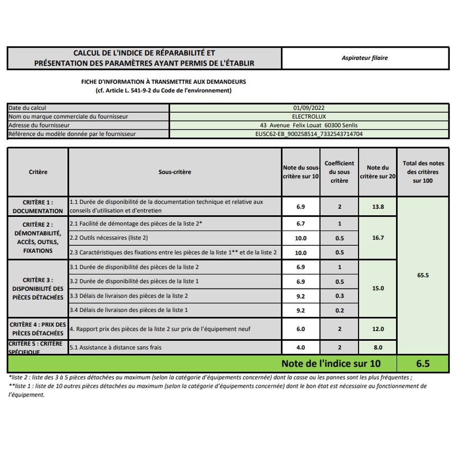 Indice de réparabilité 6,5 / 10