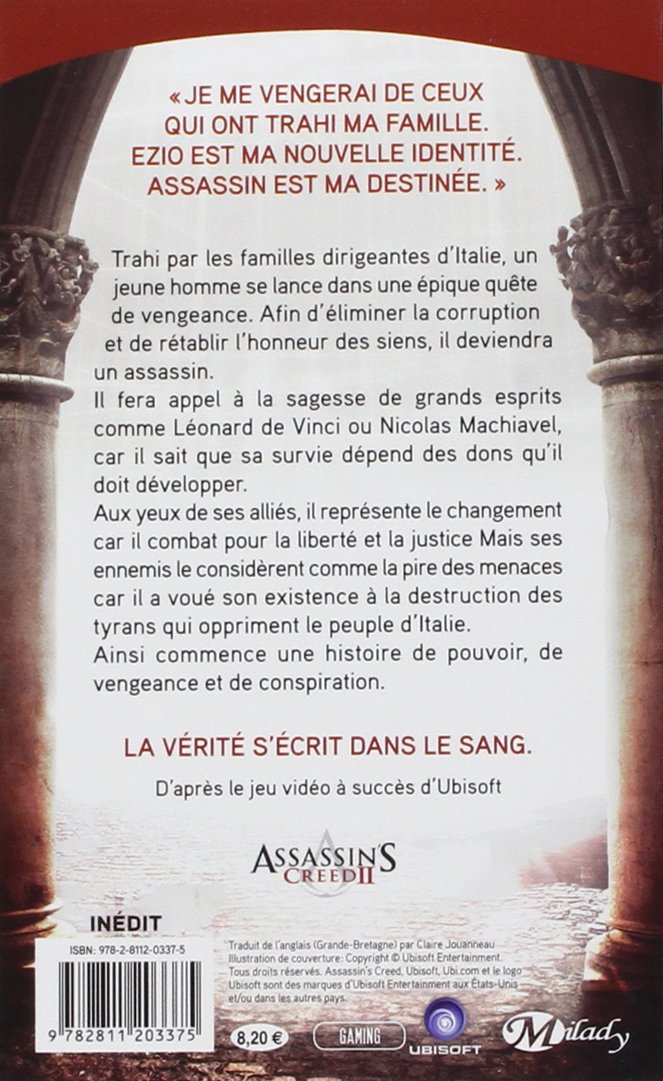 « Je me vengerai de ceux qui ont trahi ma famille. Ezio est ma nouvelle identité. Assassin est ma destinée. » Trahi par les familles dirigeantes d’Italie, un jeune homme se lance dans une épique quête de vengeance. Afin d’éliminer la corruption et de rétablir l’honneur des siens, il deviendra un assassin. Il fera appel à la sagesse de grands esprits comme Léonard de Vinci ou Nicolas Machiavel, car il sait que sa survie dépend des dons qu’il doit développer. Aux yeux de ses alliés, il représente le changement car il combat pour la liberté et la justice. Mais ses ennemis le considèrent comme la pire des menaces car il a voué son existence à la destruction des tyrans qui oppriment le peuple d’Italie. Ainsi commence une histoire de pouvoir, de vengeance et de conspiration. La vérité s’écrit dans le sang. D’après le jeu vidéo à succès d’Ubisoft.