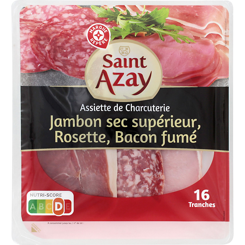 Assortiment de charcuteries prétranchées : jambon sec supérieur, rosette, bacon fumé SAINT-AZAY