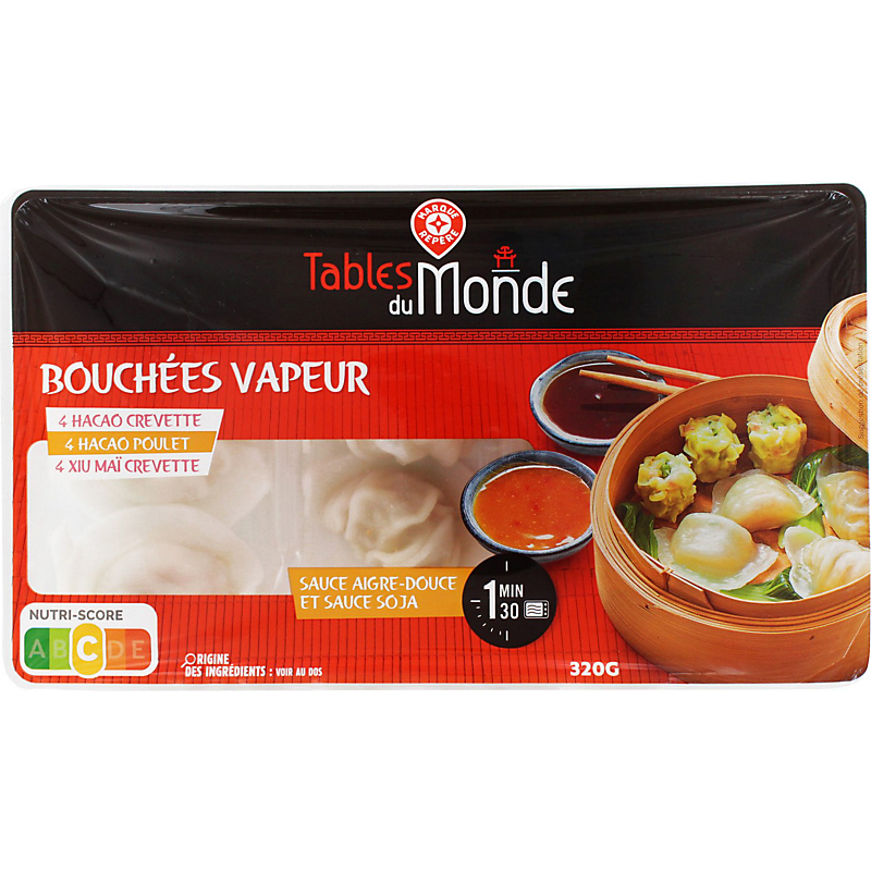 Assortiment de bouchées cuites à la vapeur, garnies d'une farce à la crevette (4 hacao crevette et 4 xiu maï crevette) et d'une farce à la viande de poulet, aromatisée (4 hacao poulet), accompagnées d'une sauce aigre-douce et une sauce au soja. TABLES DU MONDE