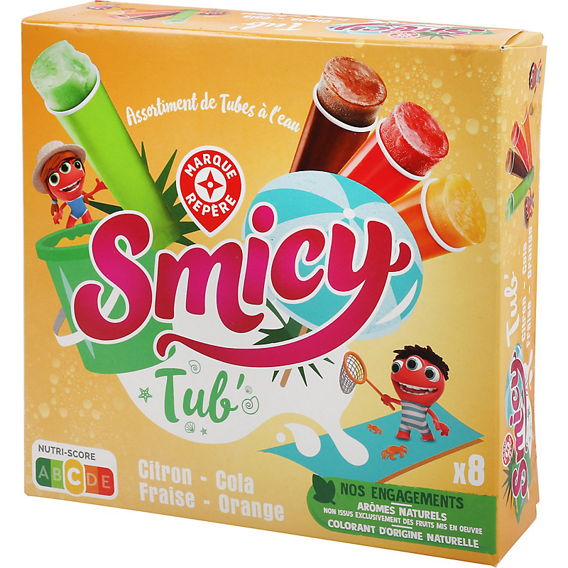 assortiment de 8 glaces à l'eau : 2 glaces à l'eau au citron, 2 glaces à l'eau saveur cola, 2 glaces à l'eau à la fraise aromatisées, 2 glaces à l'eau à l'orange aromatisées SMICY