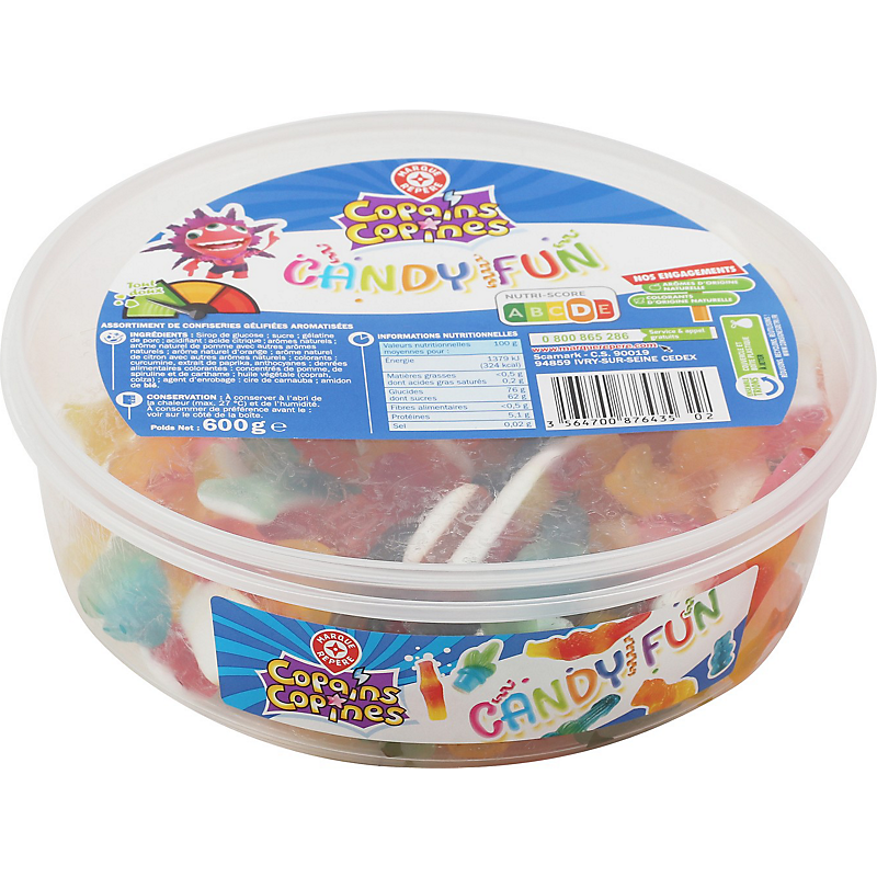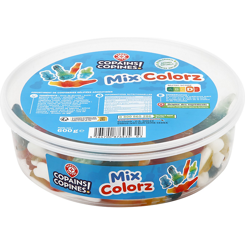 Ingrédients : Sirop de glucose ; sucre ; gélatine de porc ; acidifiant : acide citrique ; arômes naturels ; huiles végétales (colza, coprah) ; concentrés de spiruline, de carthame et de pomme ; arôme naturel de pomme avec autres arômes naturels ; arôme naturel d'orange ; colorants : curcumine, anthocyanes, extrait de paprika ; arôme naturel de citron avec autres arômes naturels ; agent d’enrobage : cire de carnauba ; amidon de blé.