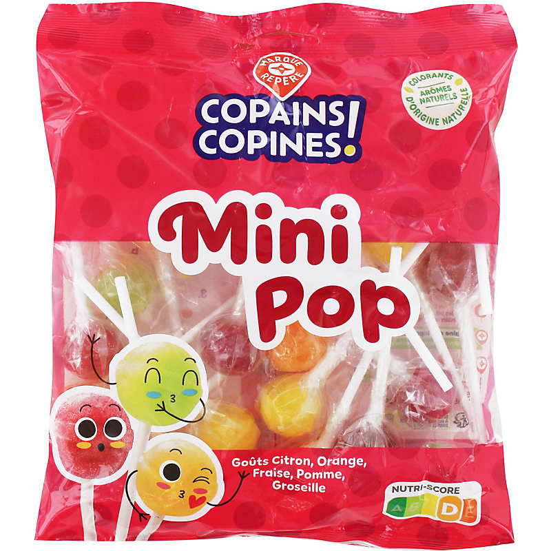 Assortiment de mini sucettes aromatisées goûts citron, orange, fraise, pomme, groseille COPAINS COPINES