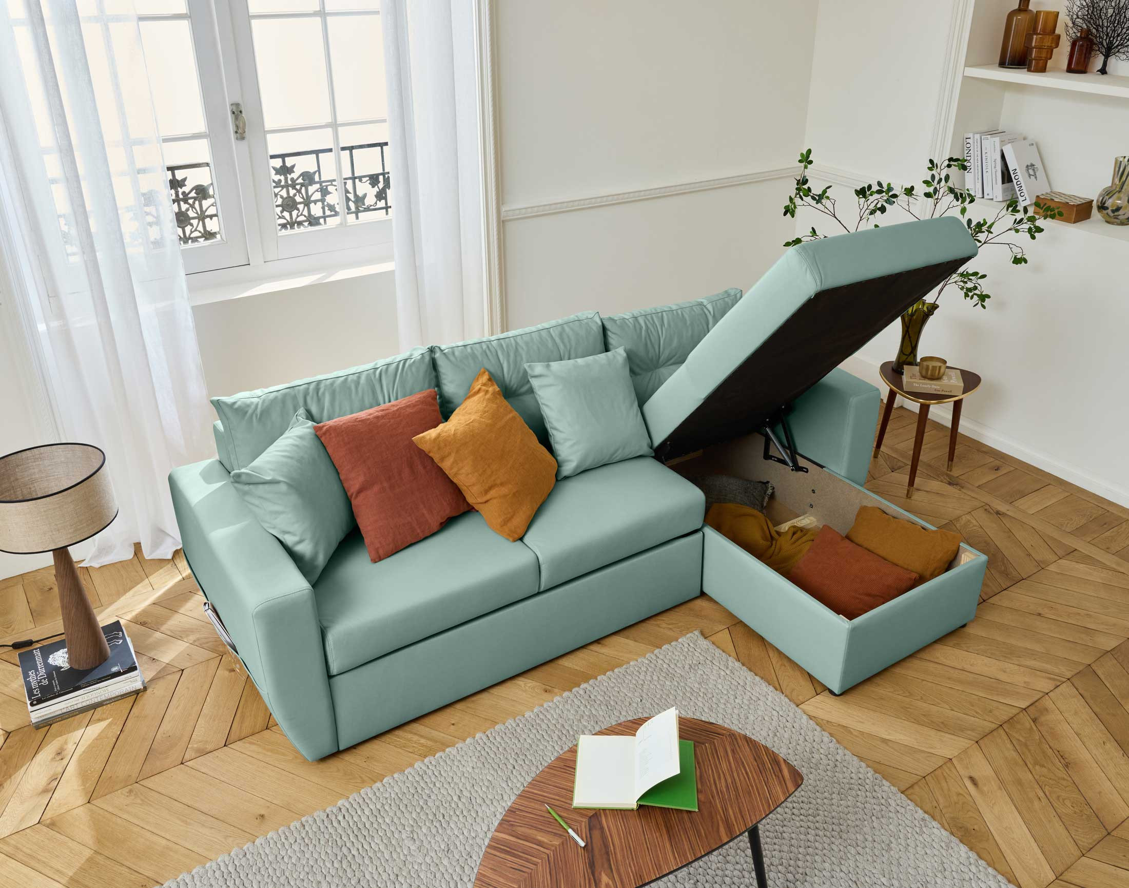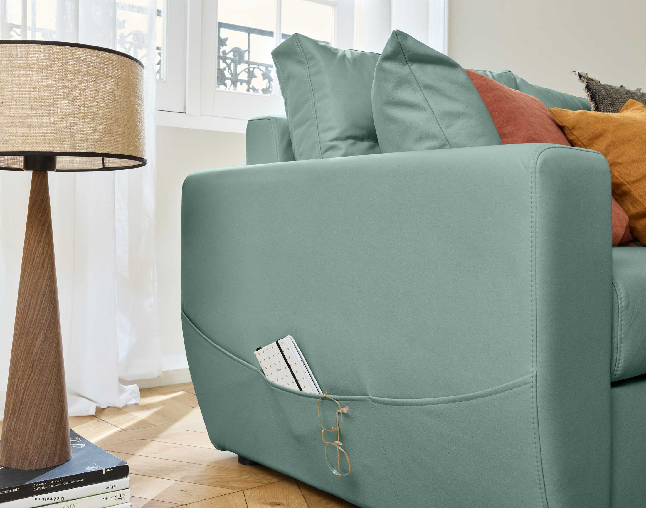 Le canapé d’angle Astoria possède une poche sur le côté de l’accoudoir afin d’y ranger télécommandes et magazines. Une fonction convertible est aussi disponible en dépliant le tiroir se trouvant sous l’assise pour accueillir occasionnellement vos proches ou encore passer un moment détente devant une série. Vous trouverez aussi un coffre de rangement sous la méridienne, pratique pour y glisser plaids, coussins. A droite ou à gauche, choisissez la position de l’angle grâce à sa fonction réversible.