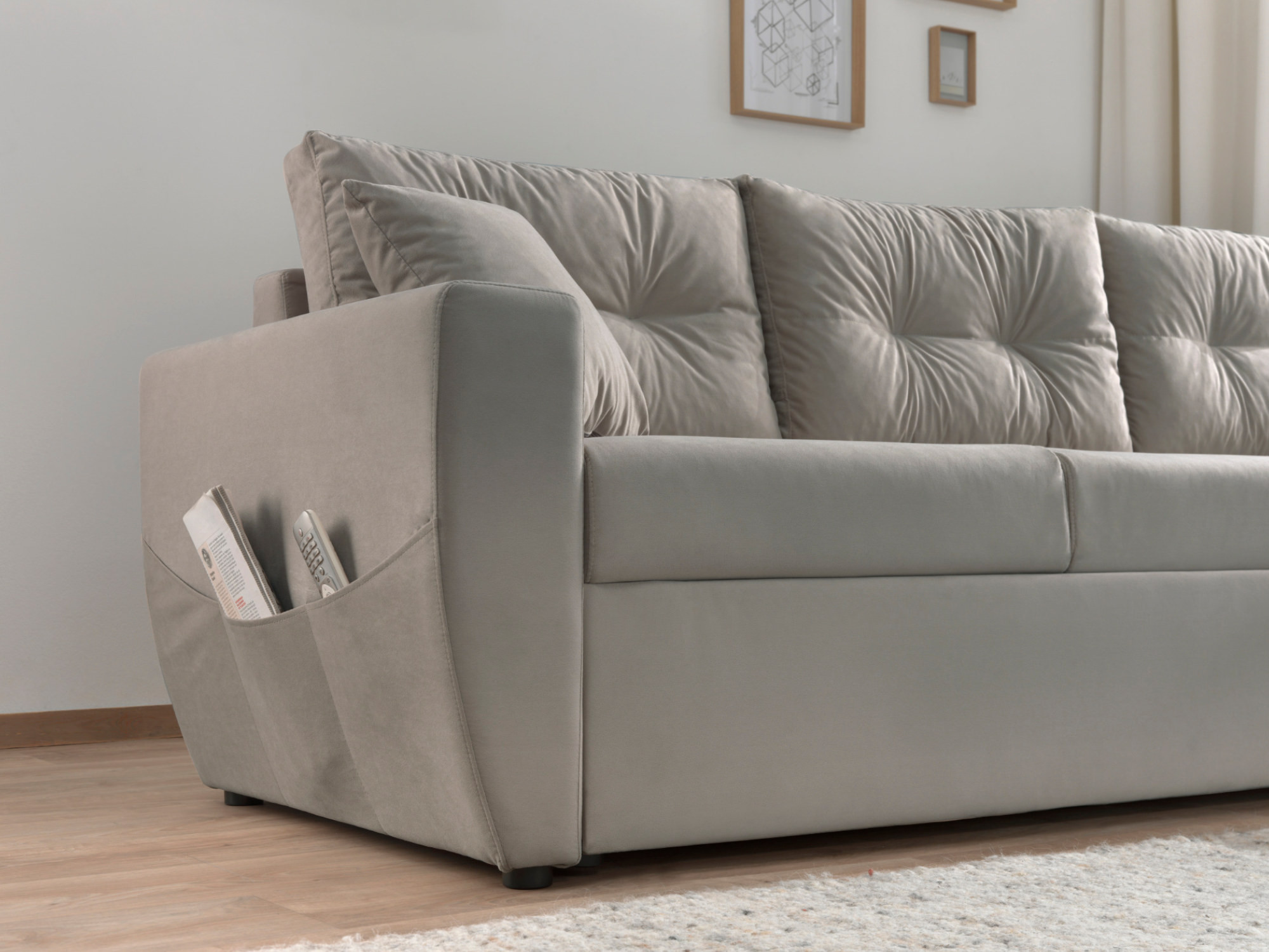 Le canapé d’angle Astoria possède une poche sur l’accoudoir afin d’y ranger télécommandes et magazines. Une fonction convertible est aussi disponible en dépliant le tiroir se trouvant sous l’assise, pratique pour accueillir vos proches occasionnellement. Vous trouverez aussi un coffre de rangement sous la méridienne, pratique pour y glisser plaids, coussins. A droite ou à gauche, choisissez la position de l’angle grâce à sa fonction réversible.
