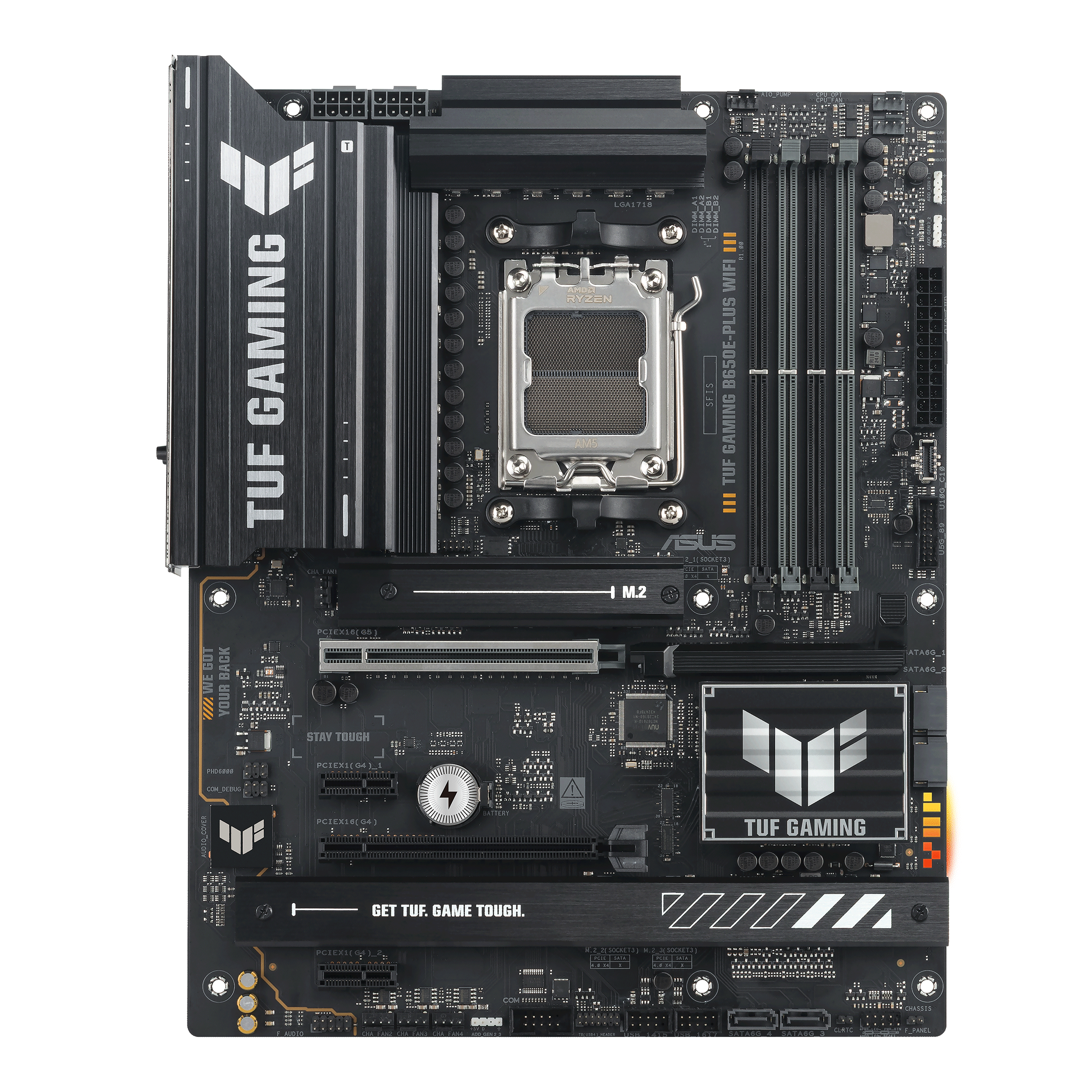 ASUS TUF GAMING B650E-PLUS WIFI. Fabricant de processeur: AMD, Socket de processeur (réceptable de processeur): Emplacement AM5, Processeurs compatibles: AMD Ryzen 7000 Series, AMD Ryzen 8000 Series, AMD Ryzen 9000 Series. Types de mémoire pris en charge: DDR5-SDRAM, Mémoire interne maximale: 256 Go, Type de support (slot): DIMM. Interfaces de lecteur de stockage prises en charge: M.2, SATA III, Types de lecteurs de stockage pris en charge: HDD & SSD, Niveaux RAID: 0, 1, 5, 10. Type d'interface Ethernet: 2.5 Gigabit Ethernet, Norme Wi-Fi: Wi-Fi 6E (802.11ax), Standards wifi: Wi-Fi 6E (802.11ax). composant pour: PC, Elément de forme de carte mère: ATX, famille de composant de produits: AMD