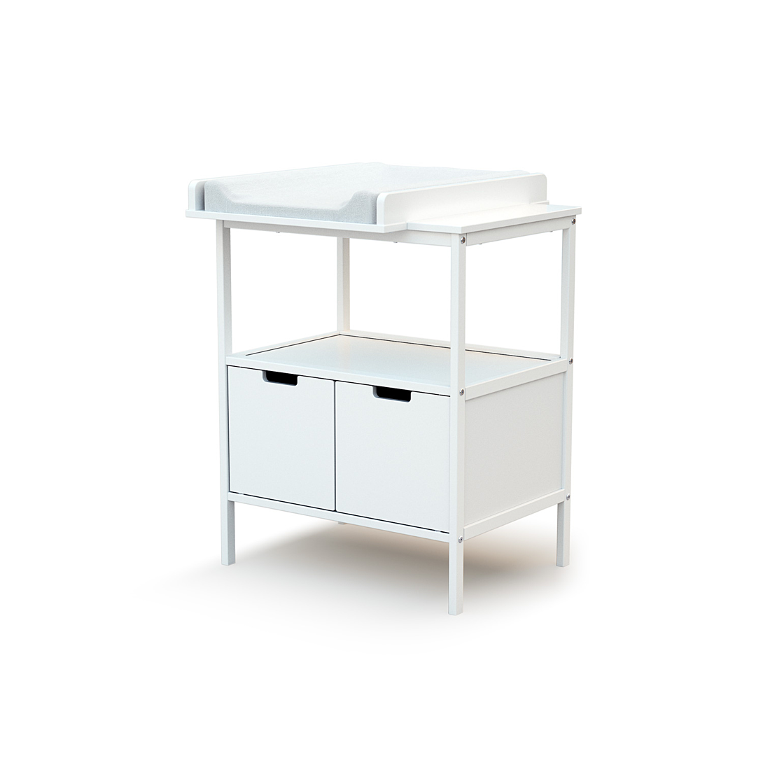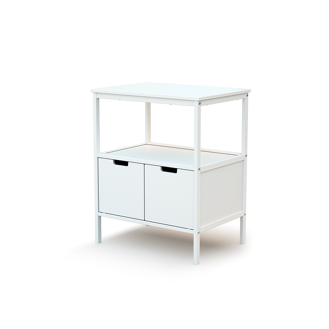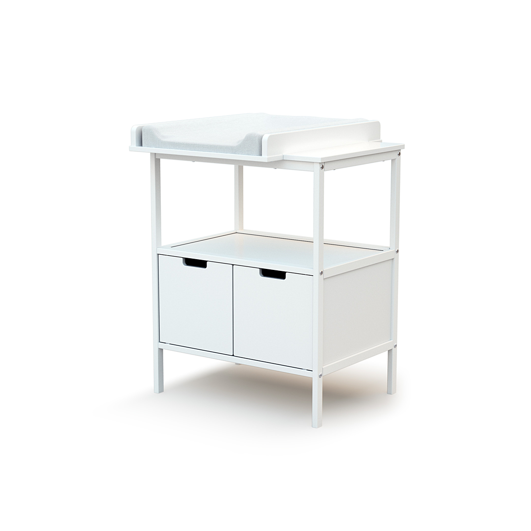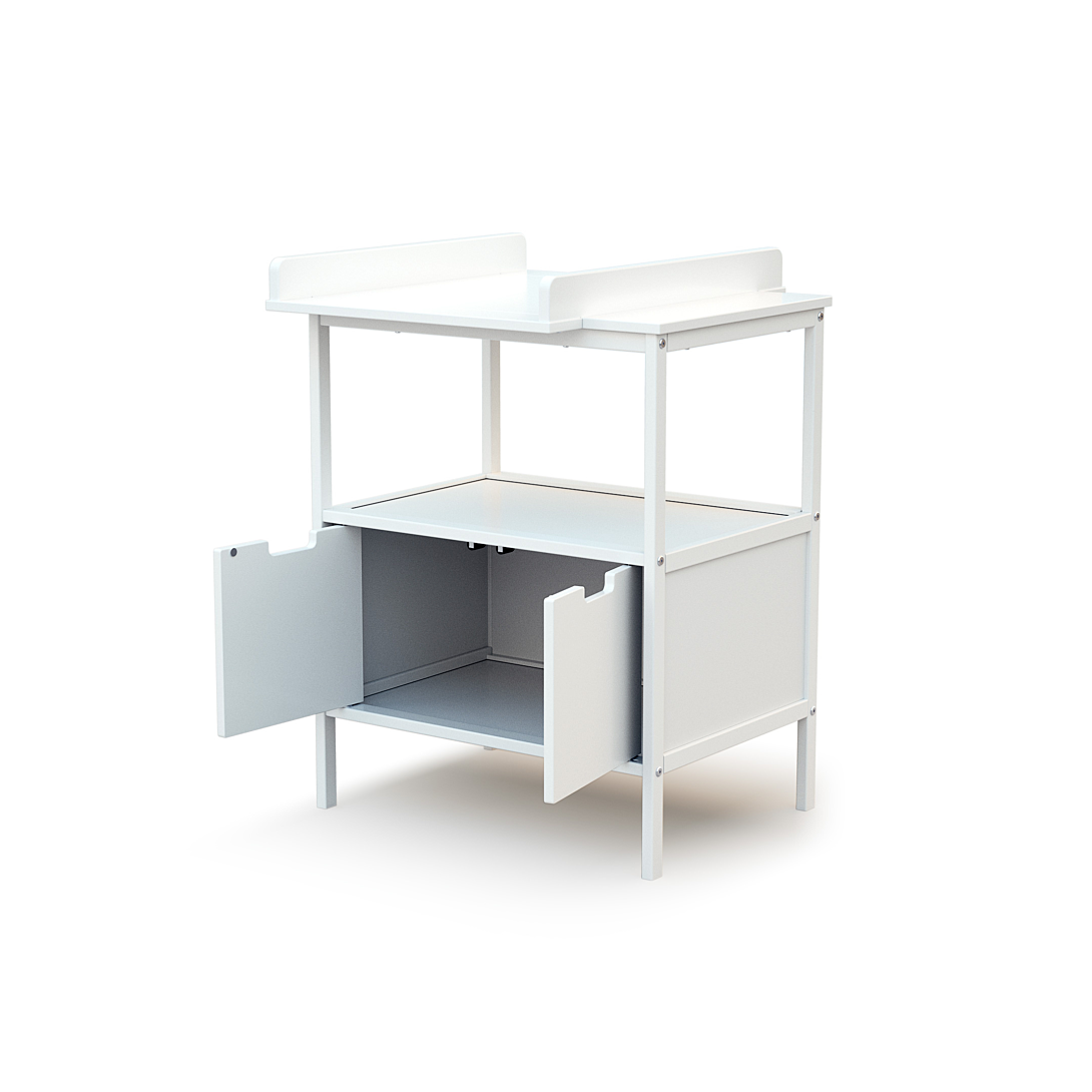 Meuble de rangement avec plan à langer. Un meuble à langer moderne et pratique : avec une large étagère ouverte en partie haute et 2 portes pour fermer la partie basse, il présente un espace de rangement ergonomique. Il est également évolutif : grâce à son plan à langer amovible, ce meuble s’intégrera très bien dans la chambre de bébé même lorsqu’il ne portera plus de couches.