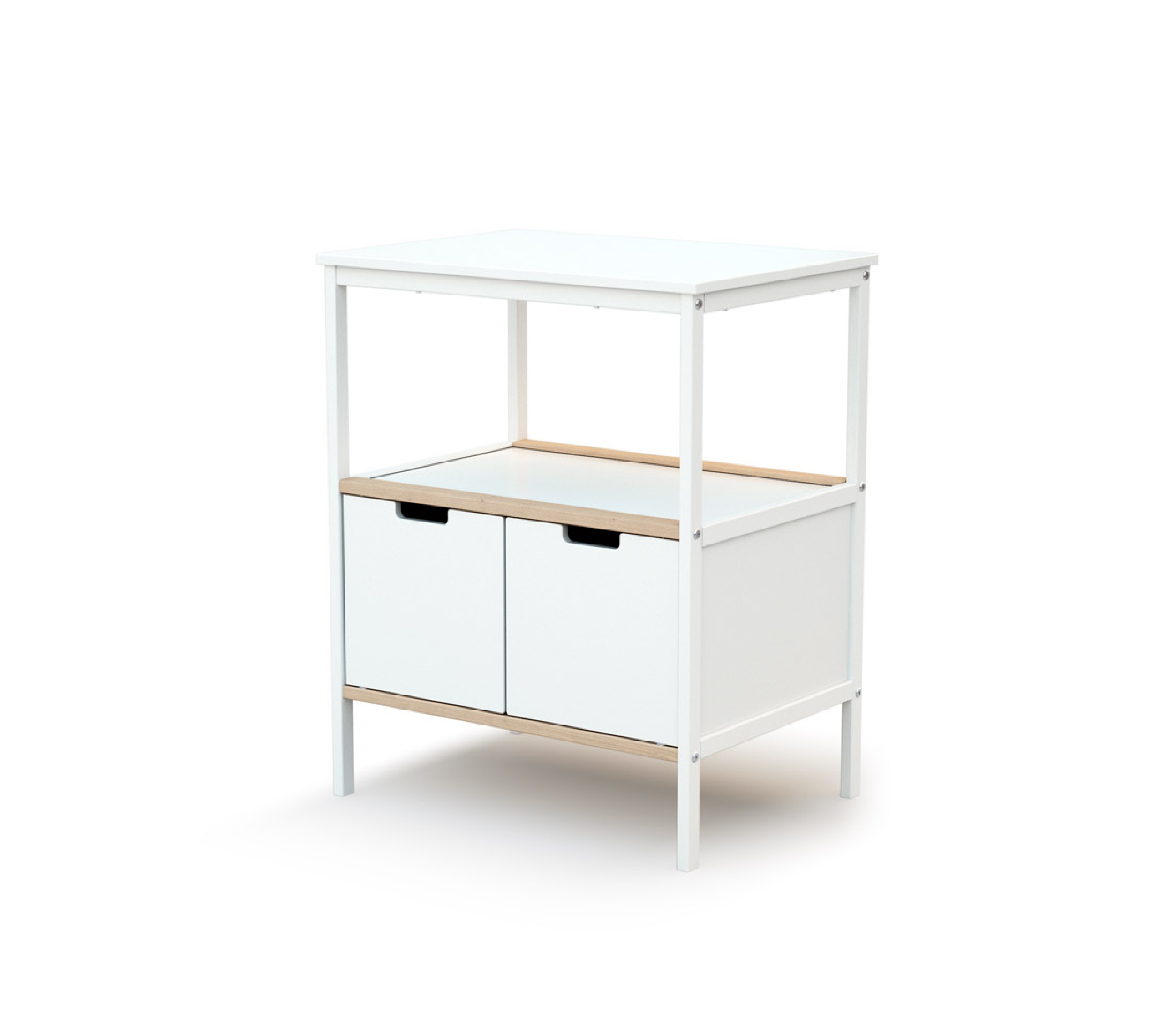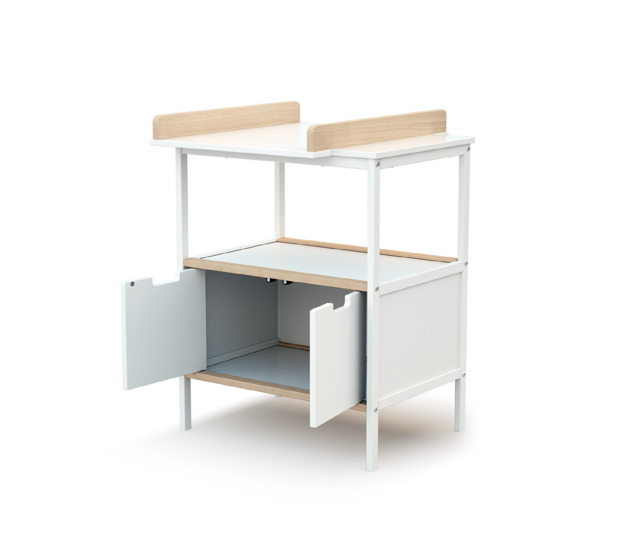 Meuble de rangement avec plan à langer. Un meuble à langer moderne et pratique : avec une large étagère ouverte en partie haute et 2 portes pour fermer la partie basse, il présente un espace de rangement ergonomique. Il est également évolutif : grâce à son plan à langer amovible, ce meuble s’intégrera très bien dans la chambre de bébé même lorsqu’il ne portera plus de couches.