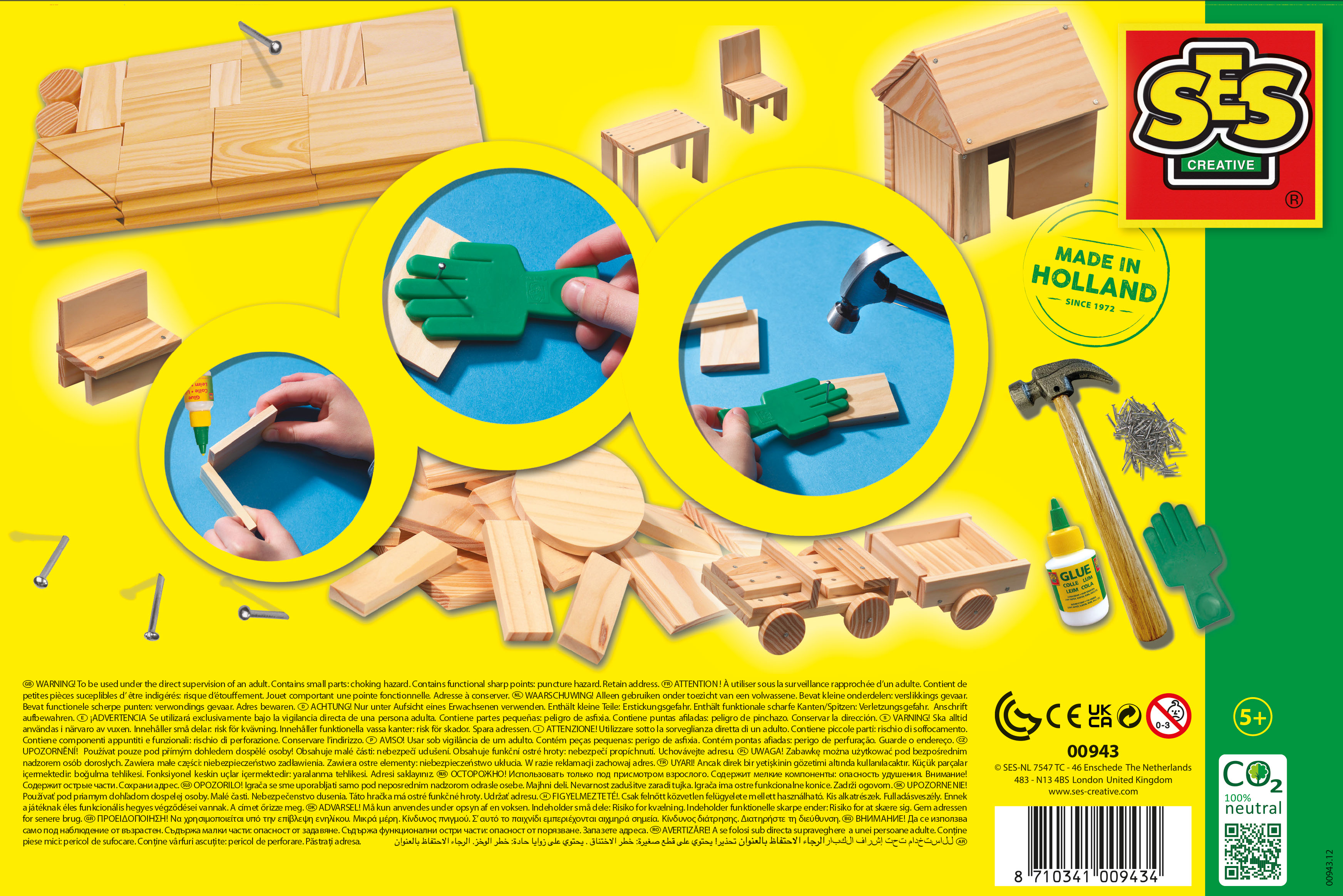 Comme Papa, construis de nombreux jouets et objets en bois avec les 57 pièces de bois de diverses formes et tailles. Grâce à la main spéciale qui va tenir les clous, aucun risque de se faire mal aux doigts ! / Comprend : 57 pièces de bois, de la colle à bois, un marteau, des clous, et la main spéciale pour tenir les clous. SES est le spécialiste des jouets créatifs depuis plus de 40 ans. Le développement de l'enfant est le concept central du développement de nos produits. Il est important que l'enfant ait la possibilité de développer ses talents et d'utiliser sa créativité en toute sécurité. Les produits que nous développons sont essentiels pour les différents stades de développement de tout enfant, apportant créativité, qualité et sécurité.