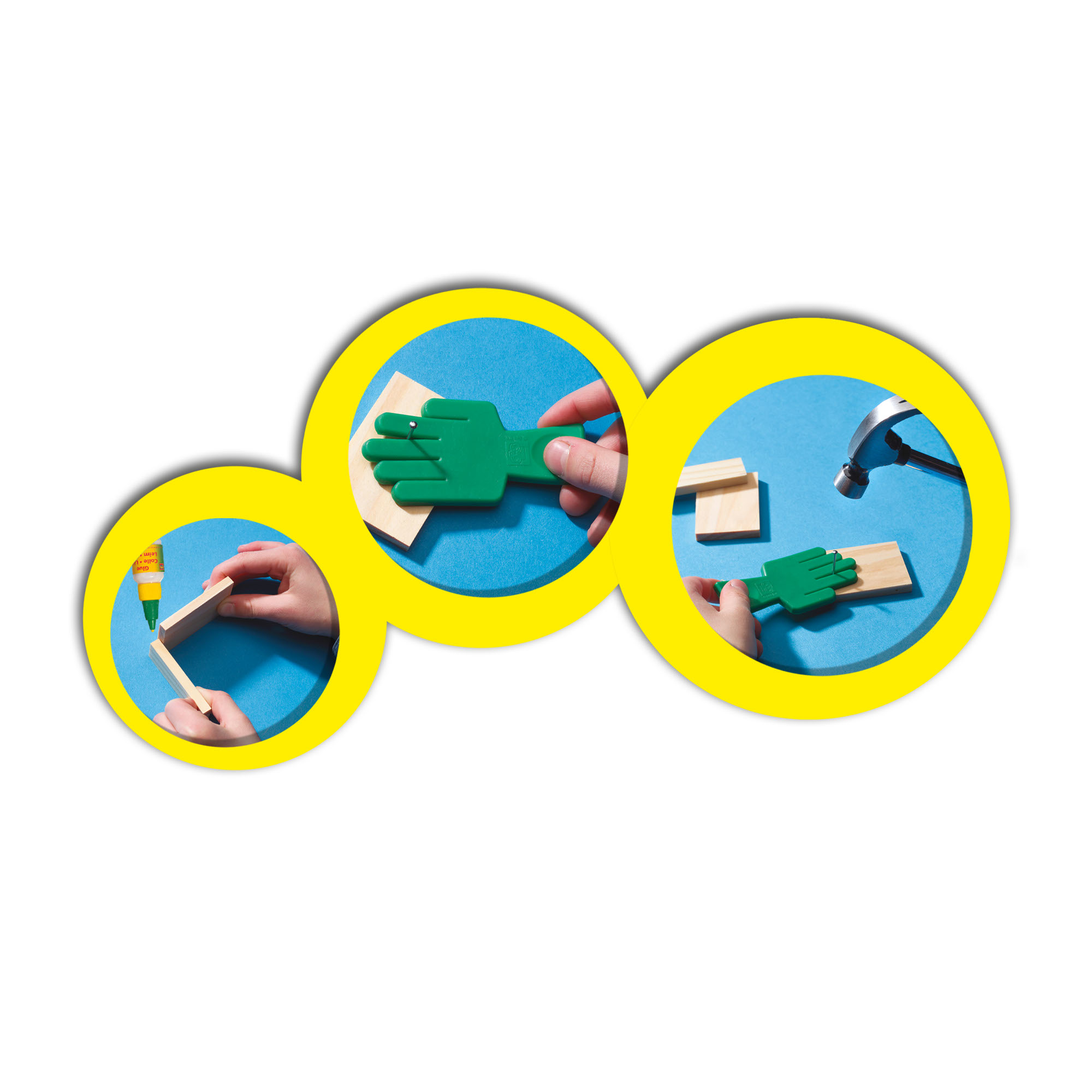 | La boîte contient | 1 x Hammer 1 x Plastic Hand 1 c Glue Assorted Nails Assorted Wooden Pieces |