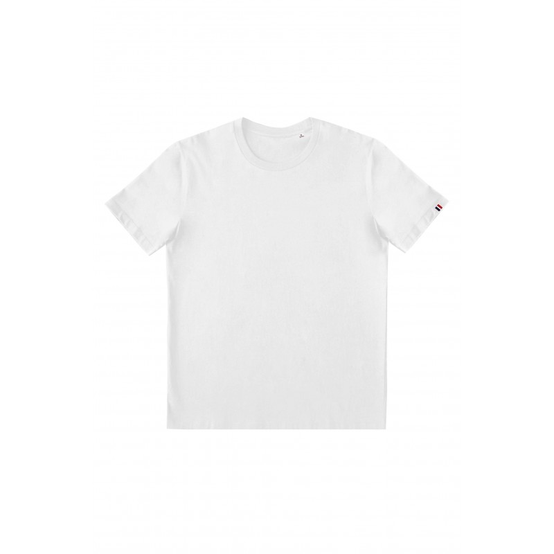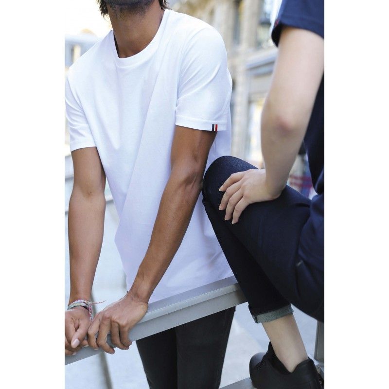 Le tee-shirt unisexe est entièrement confectionné en France à partir d'un jersey de coton peigné biologique certifié. Il est doté d'un col rond avec une bande de propreté au col, d'une coupe confortable et d'un détail tricolore en bas du corps.