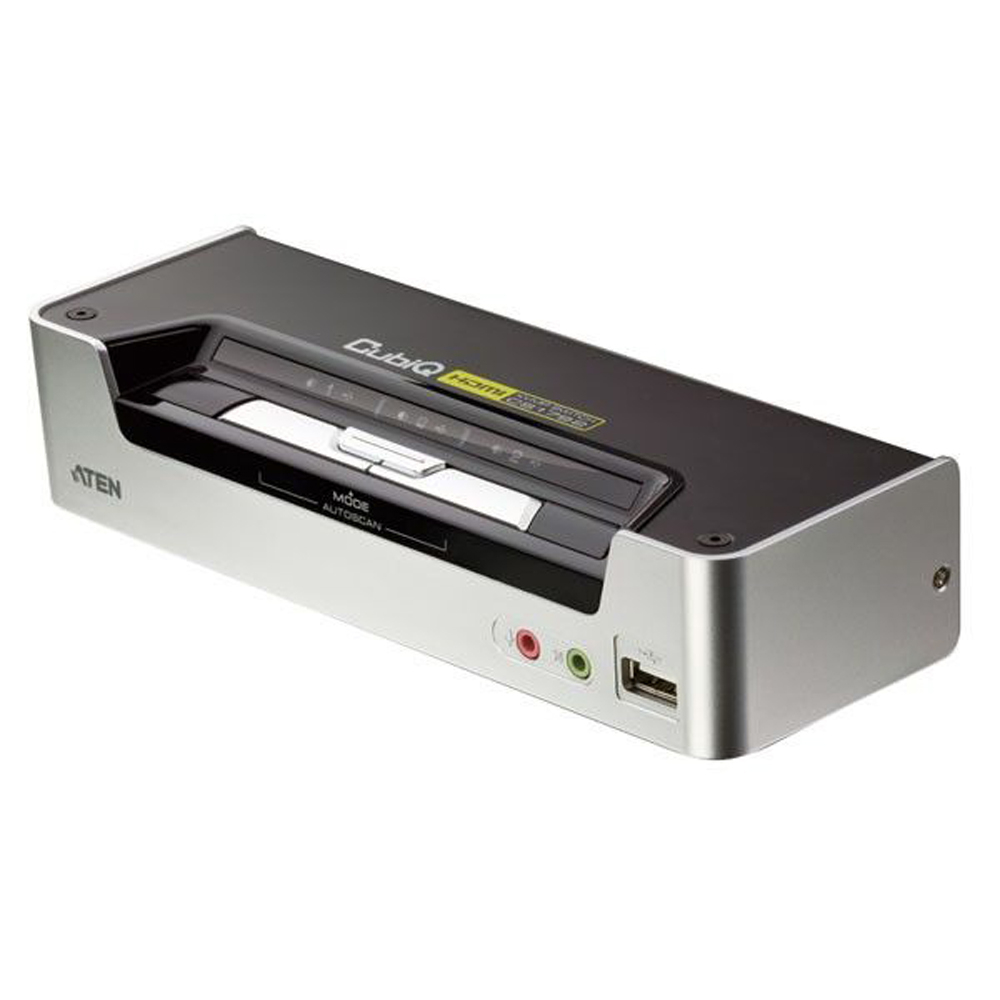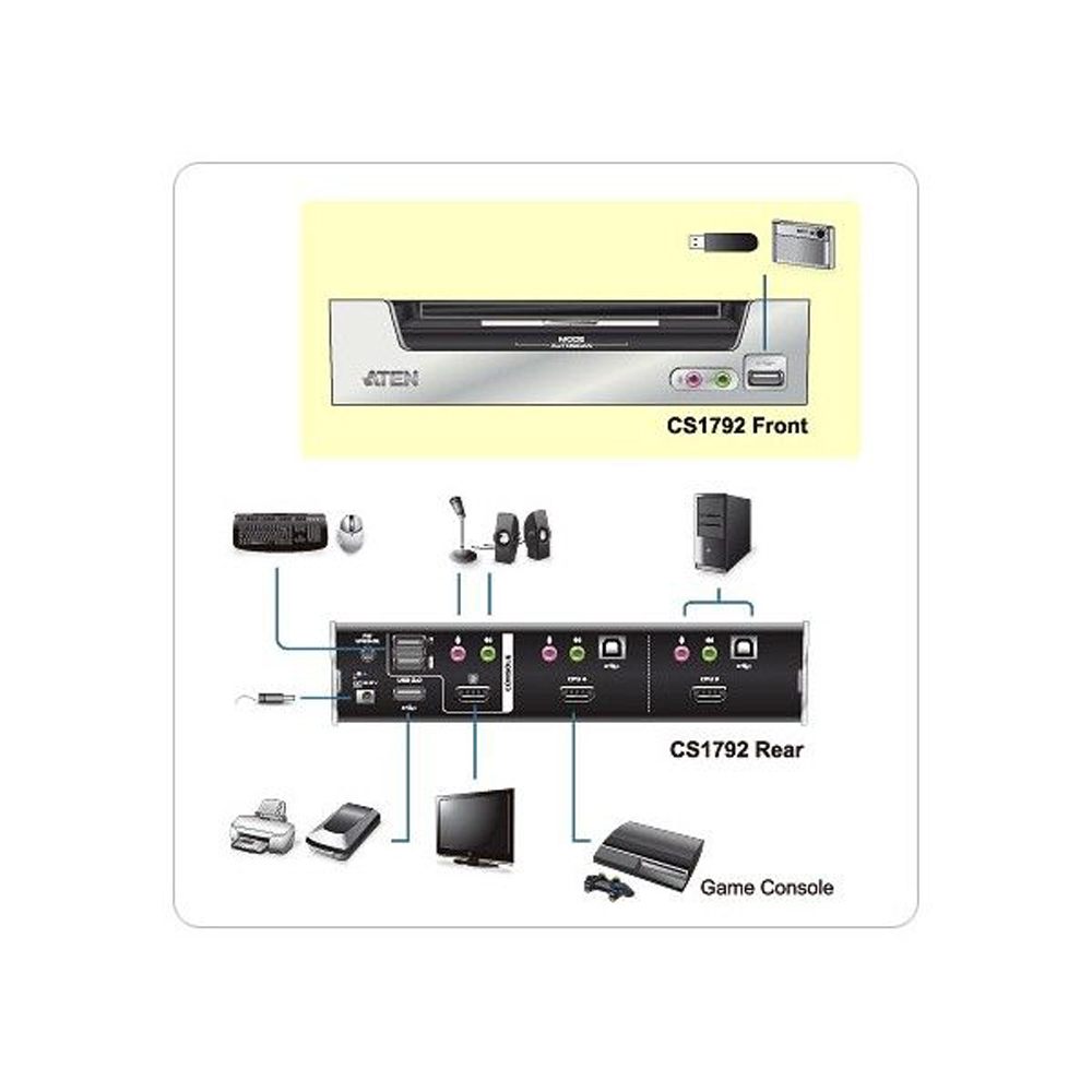 KVM HDMI 2 ordinateurs ATEN (CS1792).SWITCH KVM DESKTOP - 2 VOIES HDMI + USB + aUDIOCe commutateur KVM HDMI integre la fonction audio et un hub USB. Il peut commander 2 ordinateurs par léintermediaire déune console. Léutilisateur peut aussi Contrôler deux périphériques USB supplémentaires via les ports USB integres.Caracteristiques: Interfaces console: USB, HDMI et Jack (audio)-SWITCH KVM DESKTOP - 4 VOIES HDMI + USB + aUDIOCe commutateur KVM HDMI integre la fonction audio surround 7.1 et un hub USB. Il peut commander deux ordinateurs par l'intermediaire d'une console simple et permet a des utilisateurs de commuter entre les ordinateurs par l'intermediaire des boutons sur le commutateur ou via une combinaison de touche sur le clavier.-L'utilisateur peut aussi Contrôler deux périphériques USB supplémentaires via les ports USB integres sur le panneau avant.-Caracteristiques:Interfaces console: USB, HDMI et Jack (audio)HInterfaces UC: USB, HDMI et Jack (audio)Nombre de voies: 2résolution: 1080p (HDTV)Fonction Scan: OuiCommutation: Bouton, hotkeyPorts USB: 2 (partage de périphérique)Particularite: audio HDSupporte les souris multifonctions et les écrans aux formats Widealimentation : ExterneMultiplateforme: Windows 2000, XP, Vista / Mac / Linux / Sun-Connecteurs pour consoles et ordinateurs:-Console:1 x HDMI femelle2 x USB type a femelle (clavier/souris)4 x audio type jack (haut-parleur, micro)-Ordinateurs:-+ 2 x HDMI femelle-+ 2 x USB type B femelle (clavier/souris)-+ 4 x audio type jack (haut-parleur, micro)-+ Hub USB 2 ports (type a) pour partager imprimante, scanner...-Contenu du package:-+ 2 câbles HDMI spécifiques KVM-+ 1 adapateur USB vers PS/2 pour la console-+ 1 câble pour mise a jour du firmware-+ 1 adaptateur secteur-+ Documentation