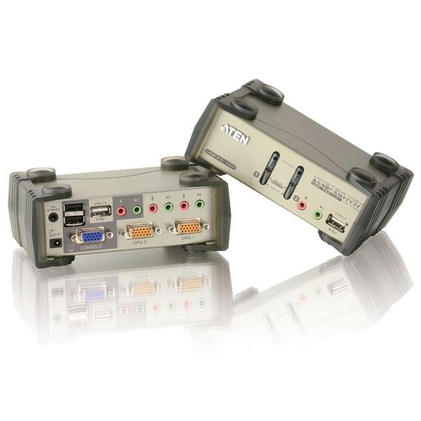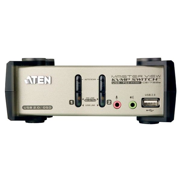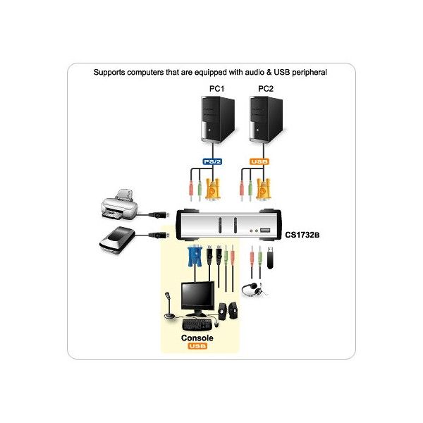 KVM VGA 2 ordinateurs ATEN CS1732B USBLe KVM VGA ATEN CS1732B kvm 2 ports usb + audio avec 2 ports hub et osd-Le Switch KVM de bureau ATEN CS1732B permet d'Accédez a 2 UC en VGA/USB a partir d'un écran/clavier/-souris PS/2 ou USB et partagez 2 périphériques en USB.- Résolution : jusqu'à 2048 x 1536- Sélection du PC par clavier ou par bouton sur le boitier- Compatible Windows - Mac Os - Linux et Sun- Connectique- Console :-1 port VGA femelle-2 ports USB A femelle(Clavier et Souris) - 4xJack 3.5 femelle - Micro et Haut parleur (2 a l'avant prioritaires et 2 à l'arrière)- Un port pour MaJ Firmware (câble fourni)- 2 Ports USB pour accessoires-2 UC : 2 ports VGA(câblage propriétaire) 2xJack 3.5 femelle Micro et Haut parleur par UC- Livré avec câbles pour UC en USB de 1.0m et un adaptateur type 040860-pour utiliser un clavier et une souris PS/2