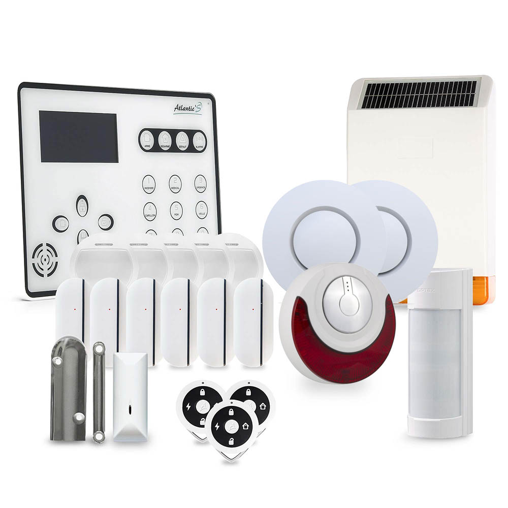 Alarme maison GSM sans fil Atlantic'S ATEOS Kit 13Avec cette alarme sans fil Atlantic'S propose un système polyvalent et à la fiabilité éprouvée. Tous les principaux attributs des précédentes générations de centrales de la marque ont été repris. Cette centrale d'alarme à transmission GSM / RTC, intègre une sirène de 105 dB, est compatible avec les systèmes de télé-surveillance et permet de raccorder jusqu'à 64 périphériques sans fil mais aussi 8 dispositifs filaires. En outre, les détecteurs volumétriques associés présentent une immunité aux animaux domestiques de moins de 15 kg.A ces caractéristiques > chez Atlantic'S, ATEOS rajoute une série de fonctionnalités particulièrement utiles et pour certaines novatrices.ATEOS dispose d'une interphonie double qui permet non seulement d'écouter les bruits ambiants mais aussi d'adresser un message à travers le haut-parleur de la centrale via un téléphone fixe ou un smartphone. Des scénarios de déclenchement peuvent être paramétrés. Il est également possible de panacher et de configurer le type d'alerte souhaité en fonction de chaque type de déclenchement d'alarme.ATEOS se distingue aussi de ses prédécesseurs par une nouvelle application smartphone de contrôle à distance de l'alarme (armement, désarmement, statut, domotique et port PGM) ainsi que par la possibilité de mise à jour par carte SD.Avec cette dernière génération de centrale, Atlantic'S propose un produit à un excellent rapport qualité-prix.Composition du kit : 1 centrale sans fil (ATEOS)6 Détecteurs d'ouverture (DO-443R)5 Détecteurs de présence (DM-443R)1 sirène intérieure flash (MD-214R)1 détecteur extérieur Optex VXI-R1 sirène solaire extérieure sans fil (MD-326)3 Télécommandes porte-clé (TE-443R)2 Détecteurs de fumée et de chaleur MD-2105R1 détecteur d'ouverture de garage (MD-212R)1 Alimentation secteur (centrale), batteries et kit de fixation2 Autocollants alarme1 Manuel d'utilisation en françaisFonctionnalités :Clavier tactile et écran rétroéclairéFréquence de fonctionnement 433,95 mHzAlarme 105dB incluse dans centraleMicrophone incorporée avec interphonie bi-directionnelleTransmetteur téléphonique intégré 100% compatible ADSLTransmetteur GSM inclusProtocole ID Contact ADEMCO pour transfert vers centre de télésurveillanceArmement total ou partielAlarme audible, par bip ou silencieuse16 codes utilisateur et 1 code administrateur4 plages d'armement ou de désarmement automatiqueTechnologie anti-brouillage broadcastingEnregistrement des détecteurs par signal ou par codeMessage d'alerte de 15 secondes personnalisableGestion à distance par téléphone, SMS et application mobileImmunité petit animaux domestiques (- de 15 kg)Scénarios d'intrusion programmablesAlertes multi-protocoles personnalisablesDélais d'entrée et de sortie programmablesJournal des événementsDurée de sonnerie des sirènes réglableAutoprotection anti-vandalismeMise à jour par carte SDAssistance vocale en Français