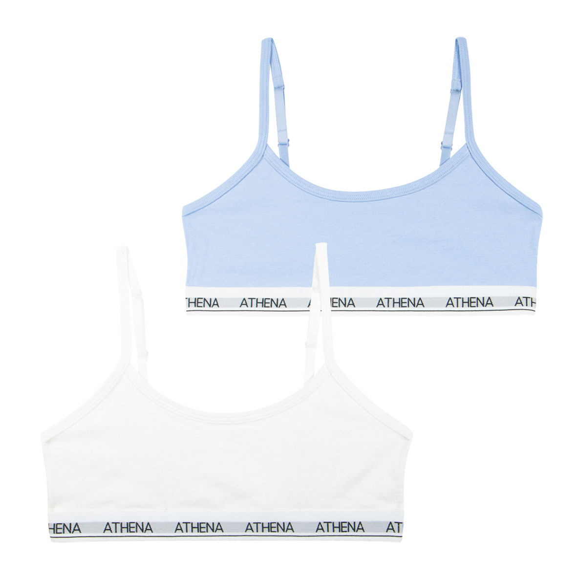 Caractéristiques de ces 2 brassières fines bretelles réglables blanc et bleu pastel ATHENA Fille