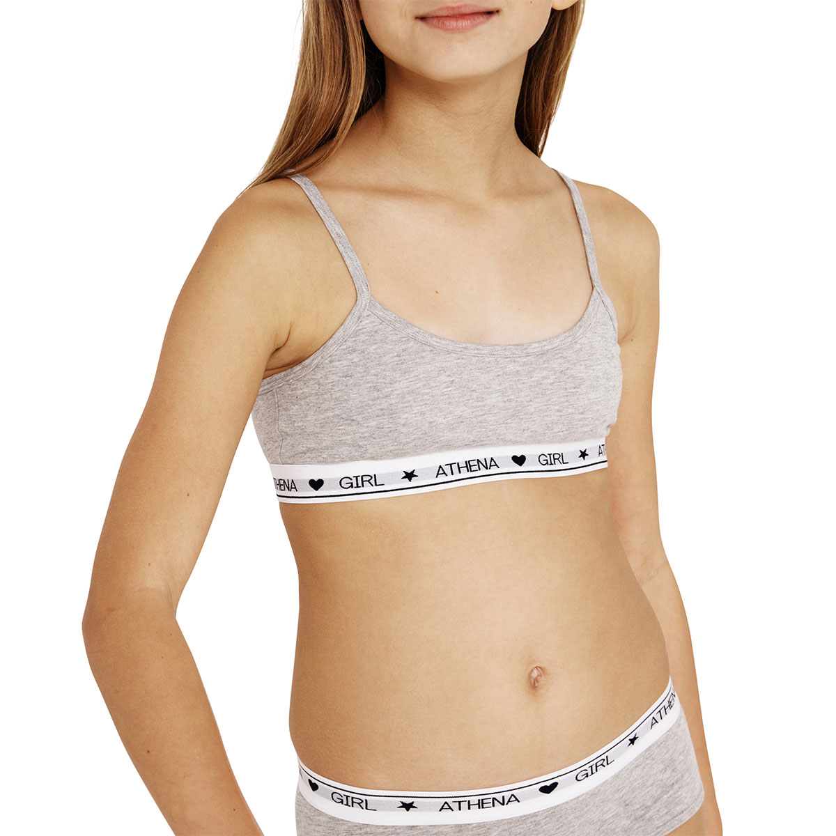 Caractéristiques de ces 2 brassières fines bretelles réglables gris chiné et bleu lagon ATHENA Fille