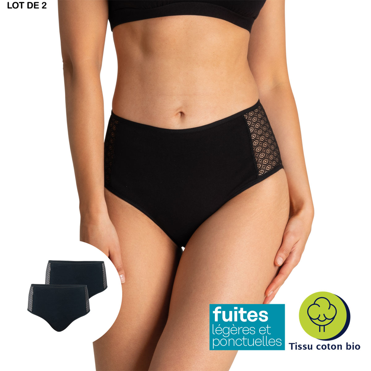 Caractéristiques de ce lot de 2 culottes pour les fuites urinaires légères et ponctuelles en coton bio pour femme ATHENA