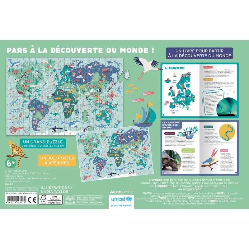 Un coffret ludique et pédagogique pour découvrir le monde. La boite contient 1 livre documentaire de 48 pages, un grand puzzle planisphère à reconstituer et un joli poster à afficher. Le projet est réalisé en partenariat avec UNICEF.