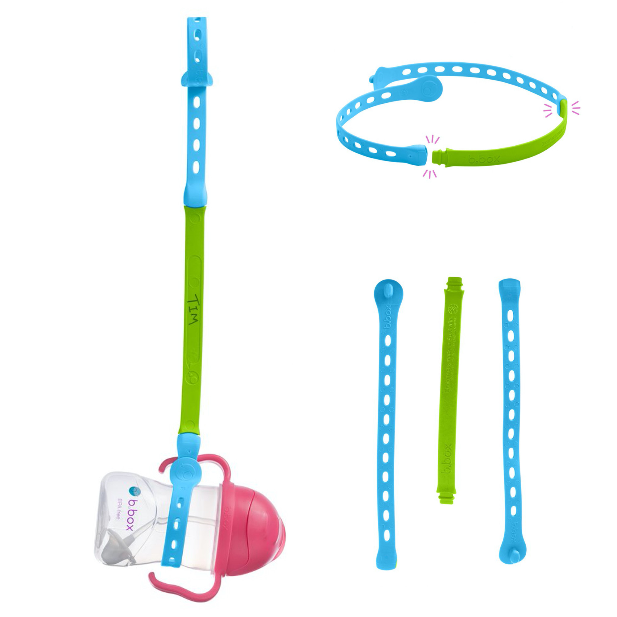 Une sangle flexible entièrement ajustable relie le biberon, la tasse ou la tétine à la poussette, à la chaise haute ou au siège auto. Bébé a toujours à portée de main ses objets du quotidien.