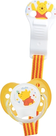 Disney en exclusivité avec dodie ! Attache sucette à l'effigie de Winnie Boucle en silicone souple qui s'adapte sur toutes les sucettes, avec ou sans anneau Ruban large et résistant Fermeture clip solide qui n'abîme pas les vêtements