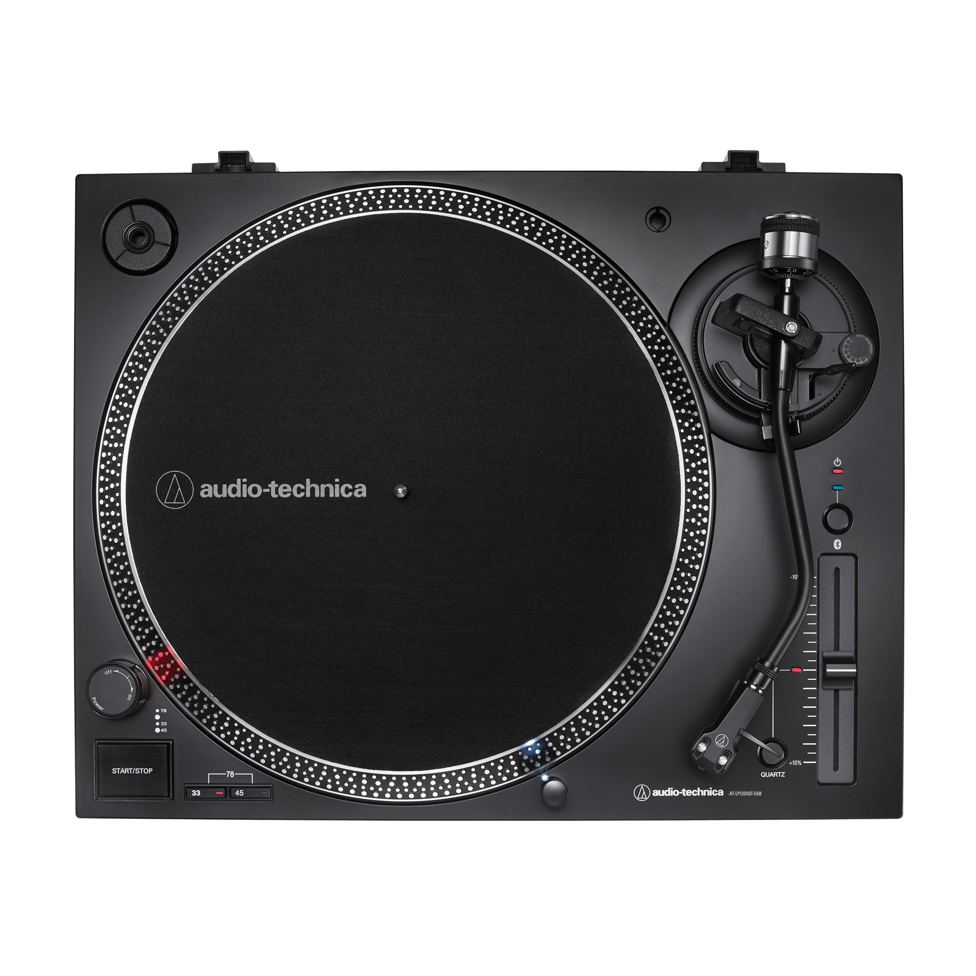 Audio-Technica AT-LP120XBT-USB. Type: Tourne-disque à entraînement direct, Opération: Manuel, Couleur du produit: Noir. Forme: Bras en forme de S, longueur du bras: 23,1 cm, Portée: 1,6 cm. Profils Bluetooth: A2DP, Portée Bluetooth: 10 m. Type d'alimentation d'énergie: Secteur, Consommation électrique typique: 2,75 W, Tension d'entrée de l'adaptateur secteur: 100 - 240 V. Largeur: 452 mm, Profondeur: 352 mm, Hauteur: 141,6 mm