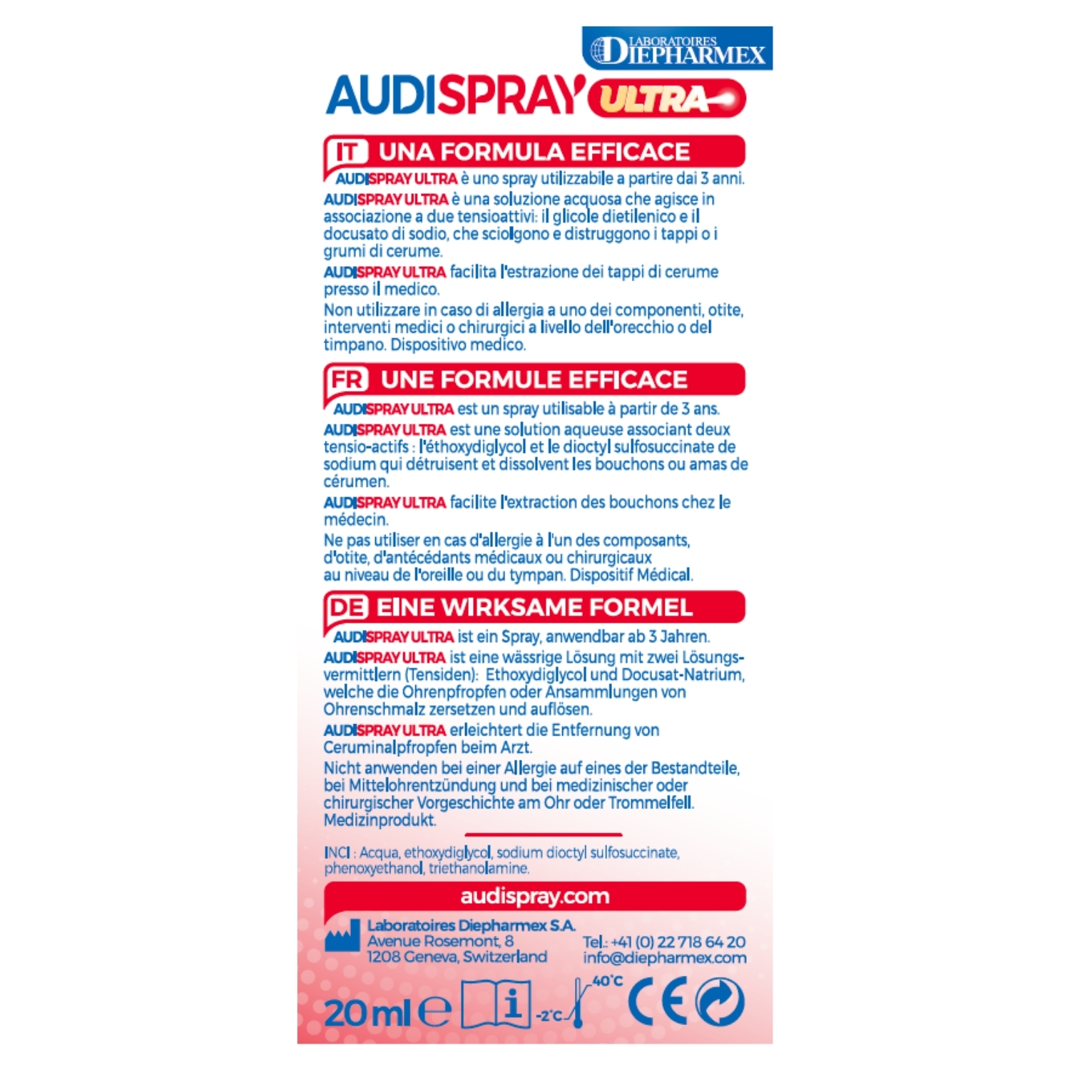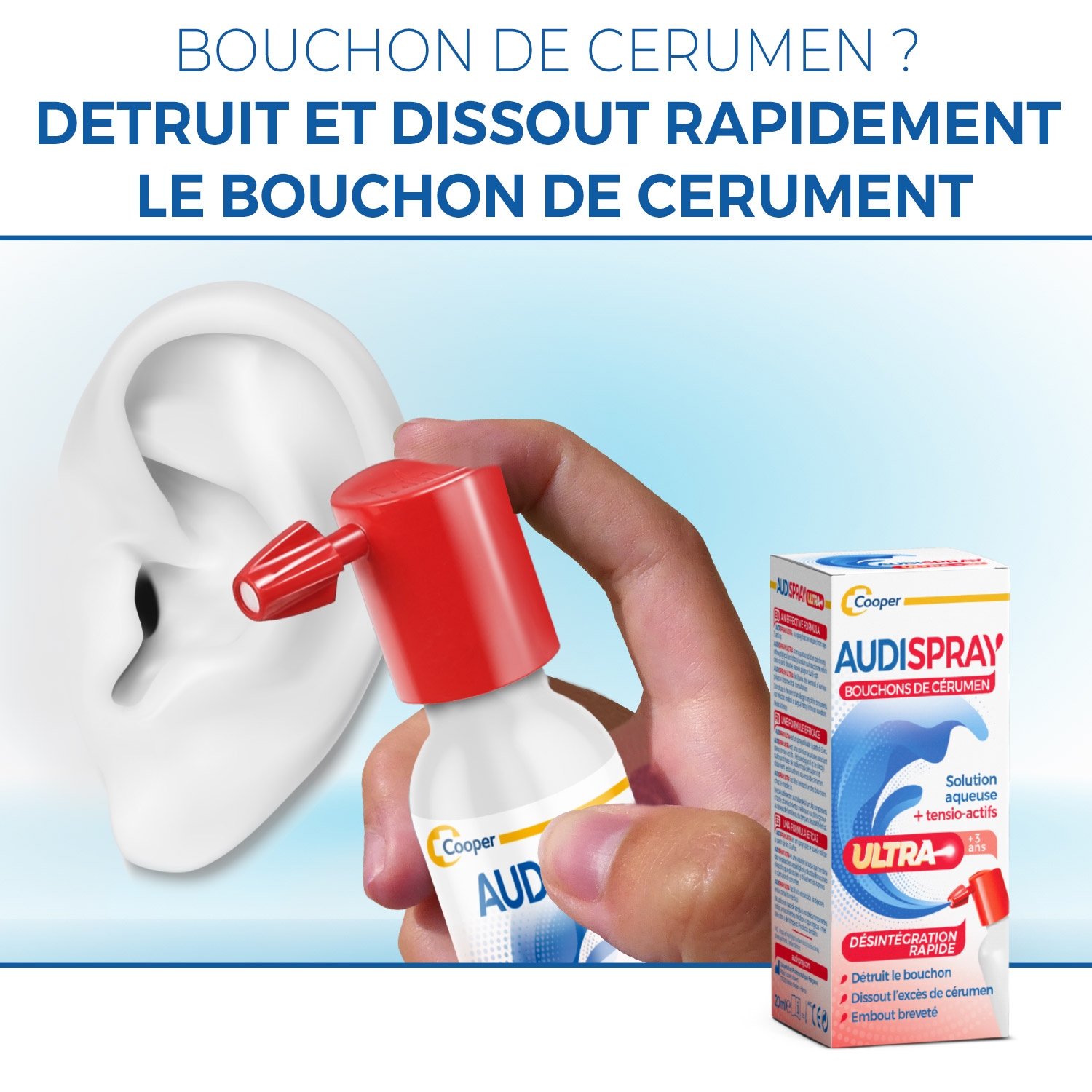 Audispray Ultra est un traitement rapide et sans rinçage indiqué contre les bouchons de cérumen déjà formés ou en formation. Sa formule à base de deux tensioactifs permet une double action :  Le dioctyl sulfosuccinate de sodium dissocie les éléments constitutifs du cérumen en bouchon ou en amas.  L’éthoxydiglycol dissout les lipides constituant le cérumen. Son embout breveté permet une brumisation douce et limitant le risque de surpression sur le tympan. Ce dispositif médical est un produit de santé réglementé qui porte, au titre de cette réglementation, le marquage CE. Lire attentivement la notice. Demandez conseil à votre médecin ou votre pharmacien. Fabricant : COOPER. Juin 2021