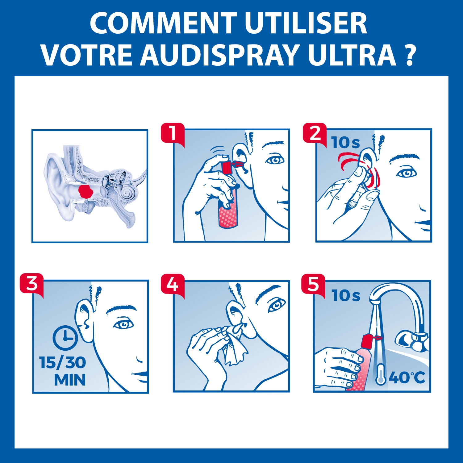 "Il est appliqué à l’aide d’un dispositif d’administration auriculaire spécialement conçu pour être utilisé dans le conduit auditif externe. 1. Orienter l’embout vers l’oreille et procéder à 1 à 2 brumisations par oreille en maintenant le flacon en position verticale. 2. Masser la base de l’oreille pendant quelques secondes. 3. Incliner la tête sur le côté pour évacuer le surplus et essuyer. 4. Rincer l’embout à l’eau chaude après chaque utilisation"