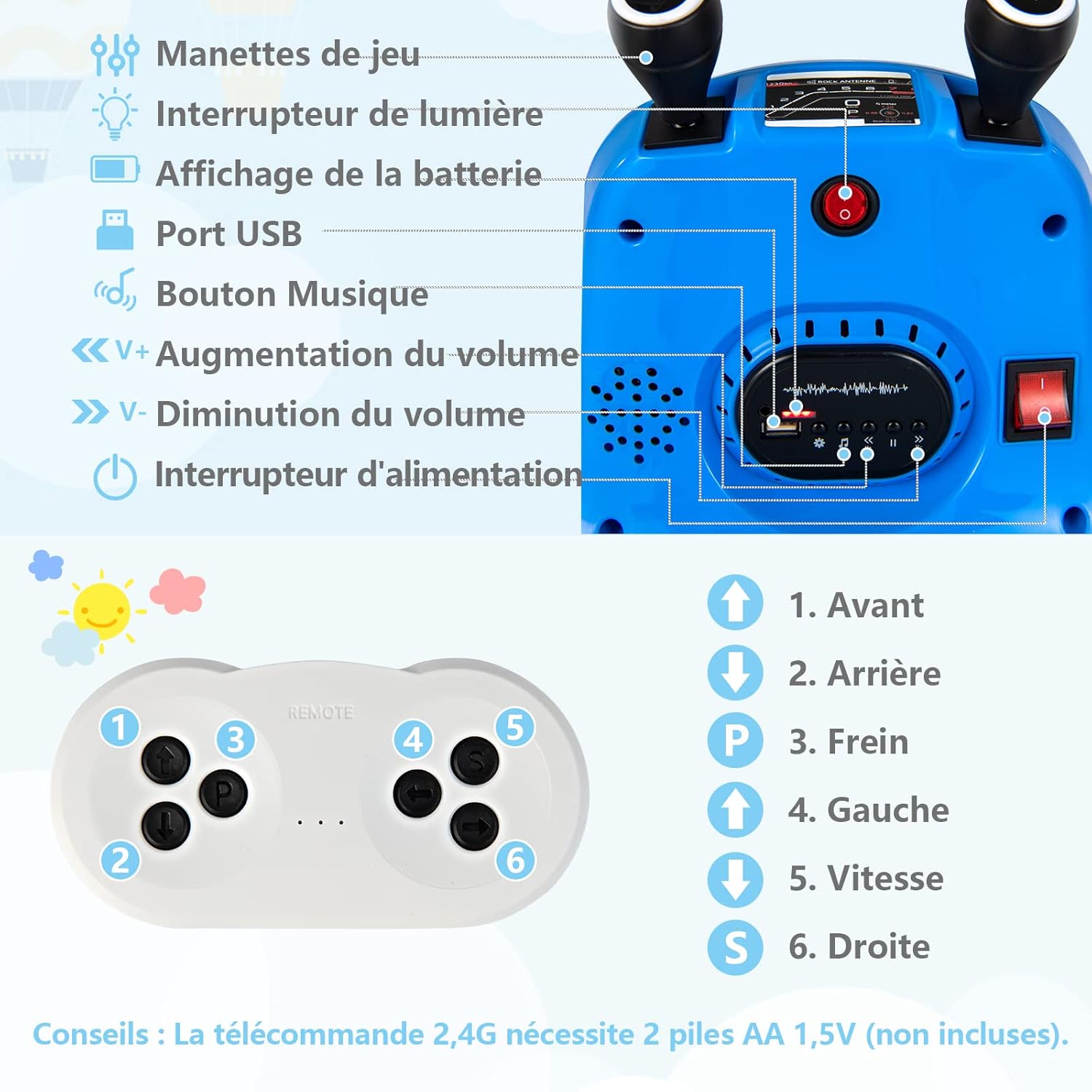 - Fonction musique et lumières colorées : le véhicule auto tamponneuse est livré avec de la musique et un port USB, vous permettant de jouer les différentes musiques selon vos préférences. Le klaxon peut également être joué avec le bouton correspondant. Les lumières LED sont colorées et perceptibles la nuit, très attrayantes pour les enfants.