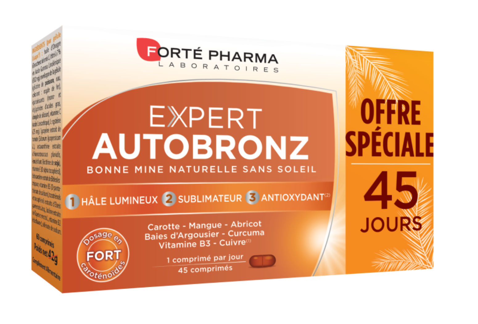 Expert Autobronz est un complément alimentaire permettant d’activer le bronzage de la peau et de la sublimer même sans soleil. Sa formule contient une sélection de pigments enlumineurs pour un hâle naturel et lumineux. Elle est complétée par un fort dosage en caroténoïdes, associés à de la vitamine B3 et au cuivre(1) qui assure une pigmentation normale de la peau. Affichez un teint hâlé et éclatant avec Expert Autobronz !