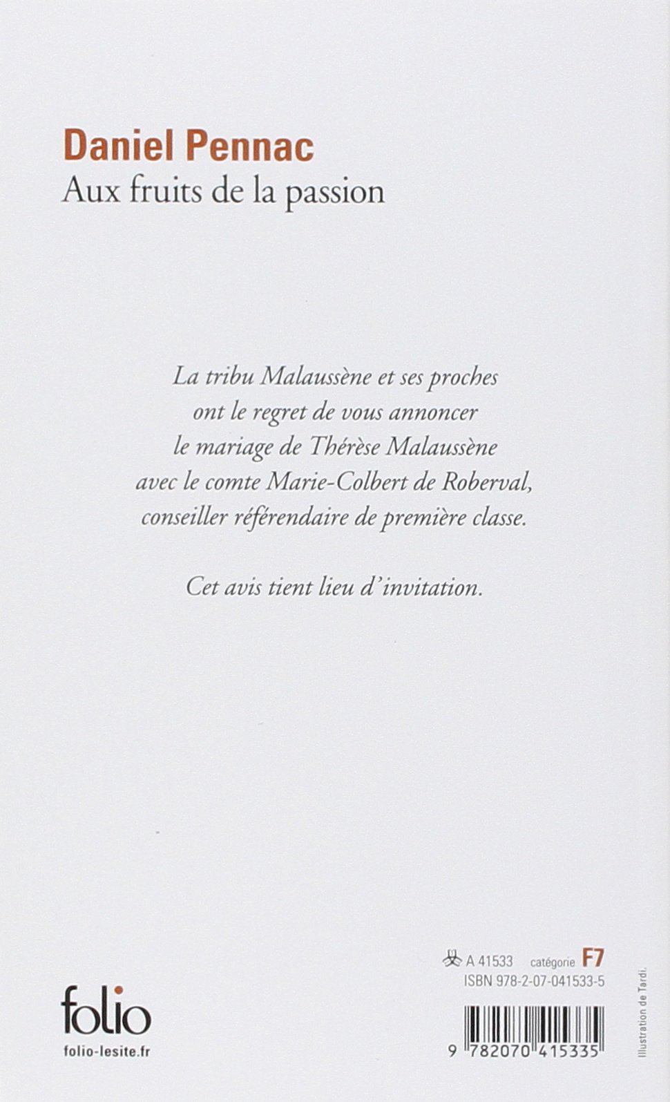La tribu Malaussène et ses proches ont le regret de vous annoncer le mariage de Thérèse Malaussène avec le comte Marie-Colbert de Roberval, conseiller référendaire de première classe. Cet avis tient lieu d'invitation.