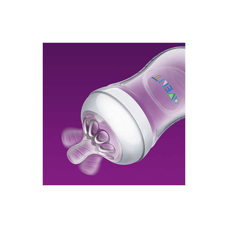 Notre biberon Natural est doté d'une tétine ultra-douce dont les caractéristiques se rapprochent plus de celles du sein. Cette large tétine imitant la forme du sein présente un design flexible en spirale et des alvéoles de confort pour permettre une tétée naturelle et faciliter l'alternance sein/biberon.