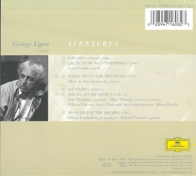 Liste des pistes 1.1 . volumina - Gyorgy Ligeti 1.2 . organ study n 1 "harmonies" - Gyorgy Ligeti 1.3 . three pieces for two pianos - Gyorgy Ligeti 1.4 . three pieces for two pianos #1 - Gyorgy Ligeti 1.5 . three pieces for two pianos #2 - Gyorgy Ligeti 1.6 . aventures - Gyorgy Ligeti 1.7 . nouvelles aventures - Gyorgy Ligeti 1.8 . nouvelles aventures #1 - Gyorgy Ligeti 1.9 . mysteries of the macabre - Gyorgy Ligeti