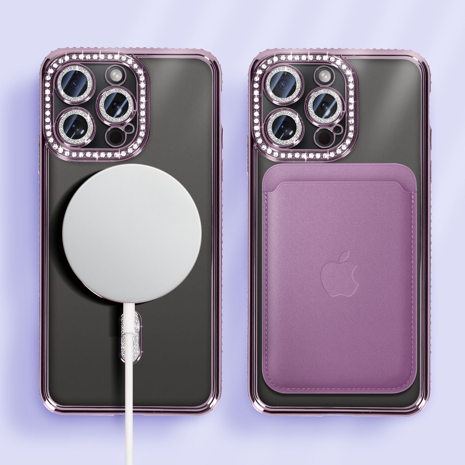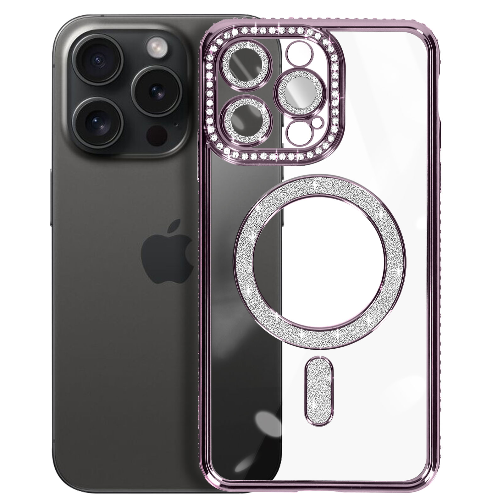 Coque diamant pour iPhone 15 Pro Max au contour strass très élégante et unique. Conception résistante avec bloc caméra protégé. Dos transparent. Cercle magnétique compatible accessoires MagSafe. Fonctions accessibles : ports et bouton caméra. Boutons latéraux redessinés.