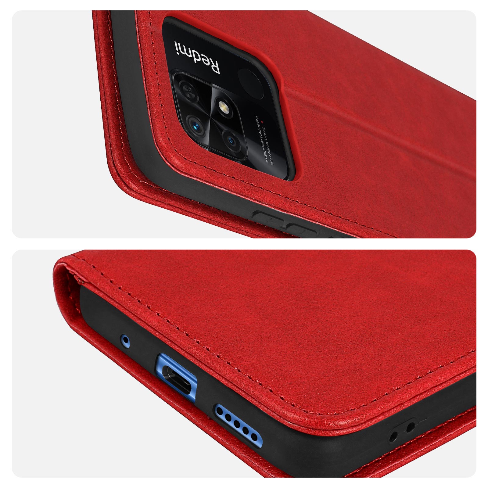 Avizar Étui Portefeuille pour Redmi 10C Chesterfield Grainé Fonction Stand Rouge / Noir