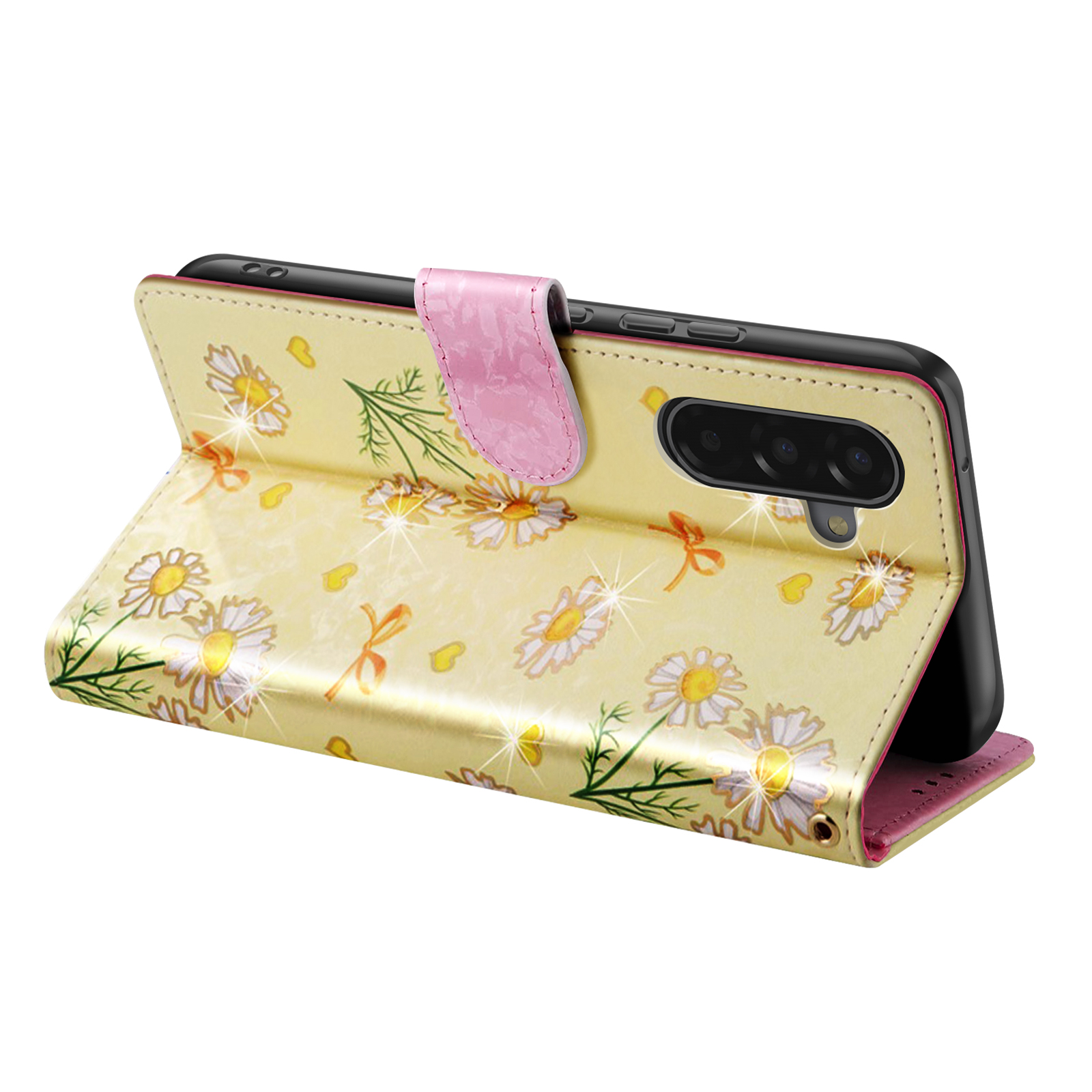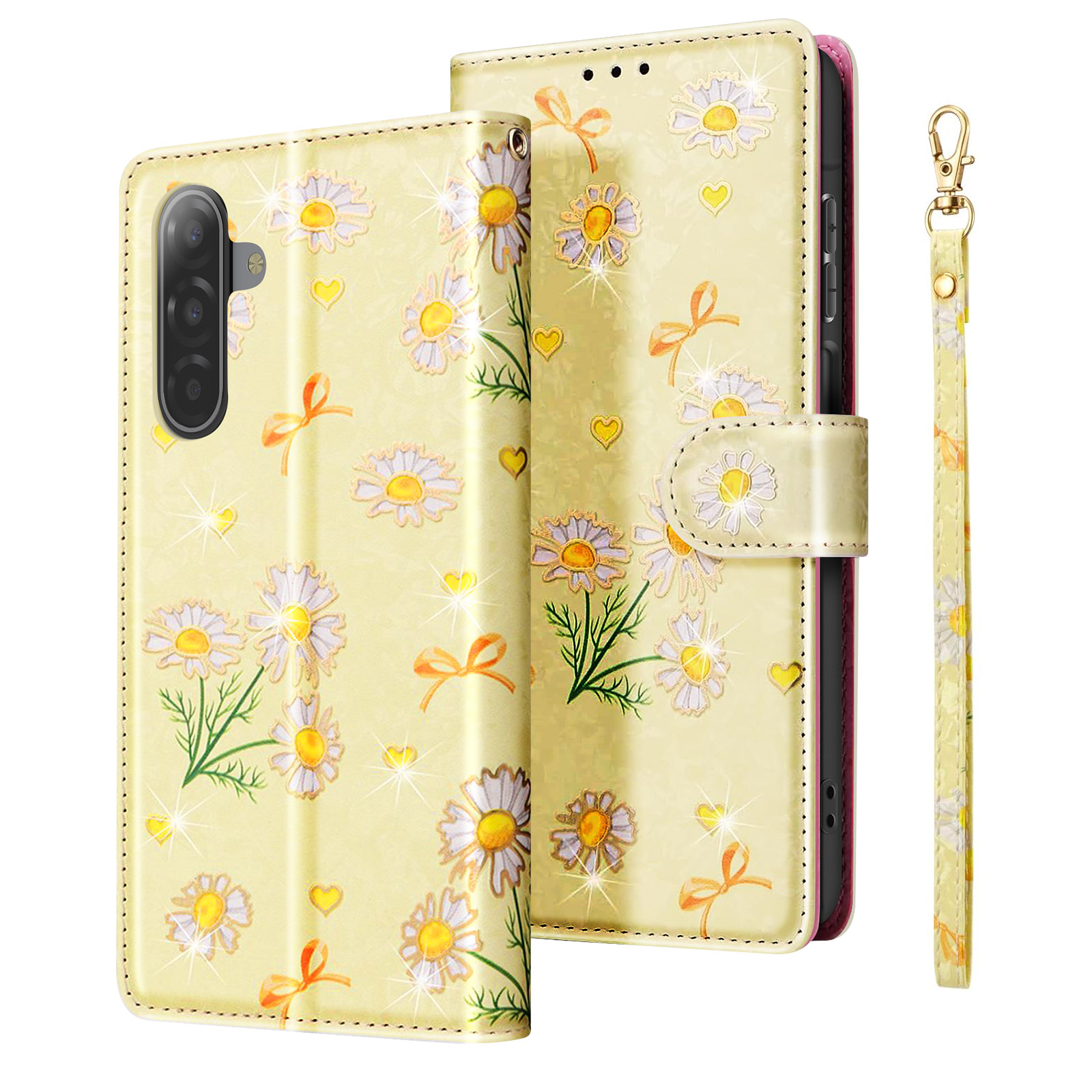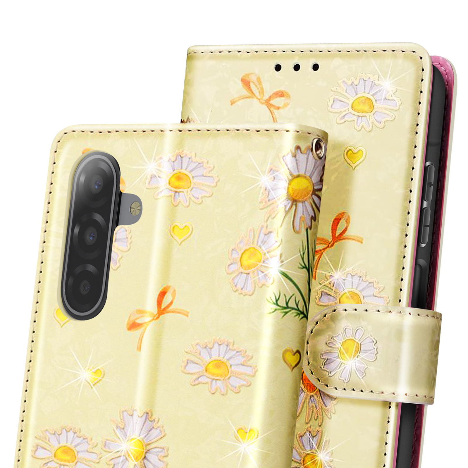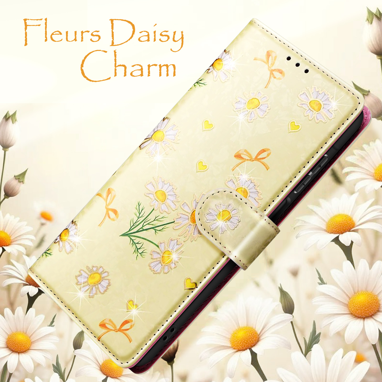 Étui portefeuille pour Samsung Galaxy A17 avec rabat aimanté, finition marguerites sur fond jaune doux. Support vidéo intégré, fonction anti RFID, emplacements cartes et billets. Fermeture par bouton pression et dragonne assortie incluse. Un étui pratique au style lumineux.
