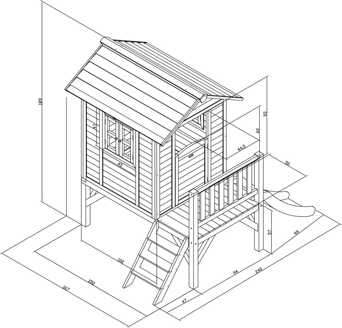 Toute la cabane est livrée peinte et traitée avec un vernis aqueux sans produit chimique. Lodge XL a une hauteur de plate-forme de 58 cm et est équipé d'un petit toboggan de 118 cm de long.