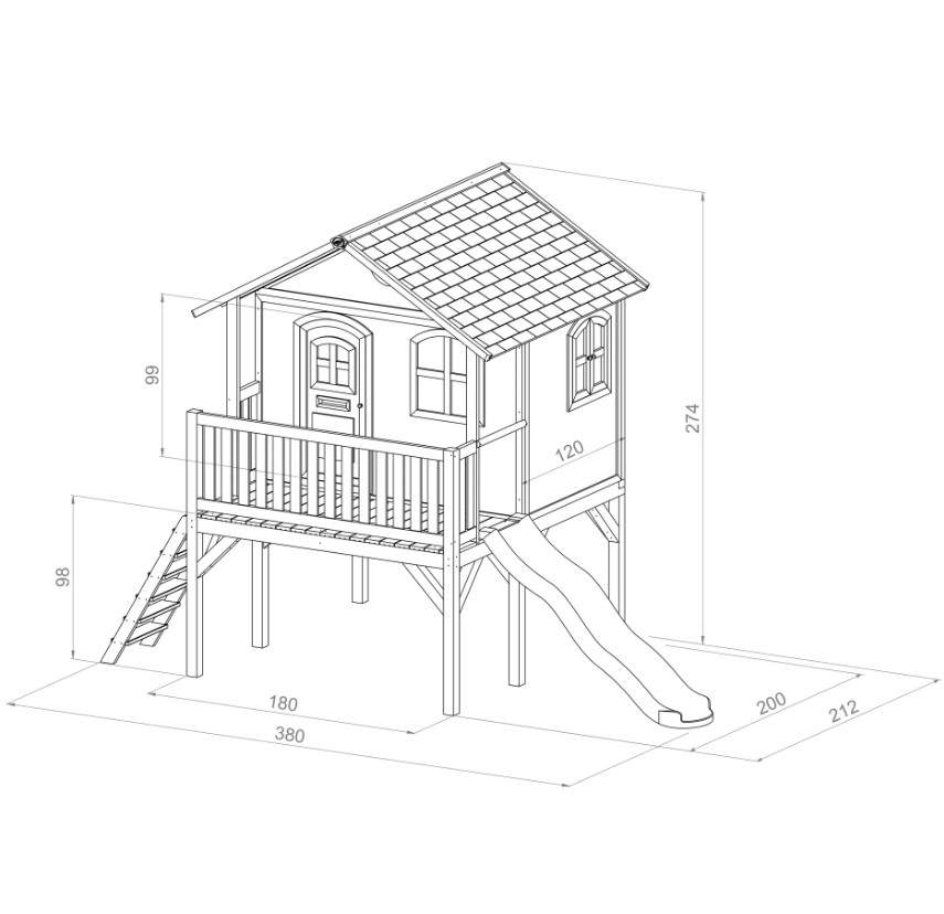 Vos enfants peuvent jouer pendant des heures avec cette maisonnette de grande qualité, fabriquée avec un bois très résistant, naturellement imputrescible, insensible aux champignons et petits animaux. Bois non-traité chimiquement, donc plus édurable et plus sur pour les enfants: Dimensions au sol: Largeur 377 x profondeur 200 x 274cm (H).