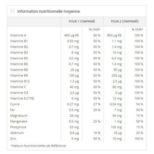 Ingrédients : Détail des ingrédients 12 Vitamines : Vitamine A, B1, B2, B3, B5, B6, B8, B9, B12, C, D3 et E (?-TE), 5 Minéraux / Oligo-éléments : Cuivre, Fer, Manganèse, Sélénium et Zinc. Information nutritionnelle moyenne Pour 1 comprimé %VNR* Pour 2 comprimés %VNR* Vitamine A (ER) 400 µg 50% 800 µg 100% Vitamine B1 0,55 mg 50% 1,1 mg 100% Vitamine B2 0,7 mg 50% 1,4 mg 100% Vitamine B3 8 mg 50% 16 mg 100% Vitamine B5 3 mg 50% 6 mg 100% Vitamine B6 0,7 mg 50% 1,4 mg 100% Vitamine B8 25 µg 50% 50 µg 100% Vitamine B9 100 µg 50% 200 µg 100% Vitamine B12 1,3 µg 50% 2,5 µg 100% Vitamine C 40 mg 50% 80 mg 100% Vitamine D3 2,5 µg 50% 5 µg 100% Vitamine E (?-TE) 6 mg 100% 12 mg 100% Cuivre 0,27 mg 27% 0,54 mg 54% Fer 3,5 mg 25% 7 mg 50% Magnésium 28 mg 56 mg 15% Manganèse 0,5 mg 25% 1 mg 50% Phosphore 53 mg 105 mg 15% Sélénium 8,8 µg 16% 18 µg 32% Zinc 5 mg 50% 10 mg 100% *Valeurs Nutritionnelles de Référence