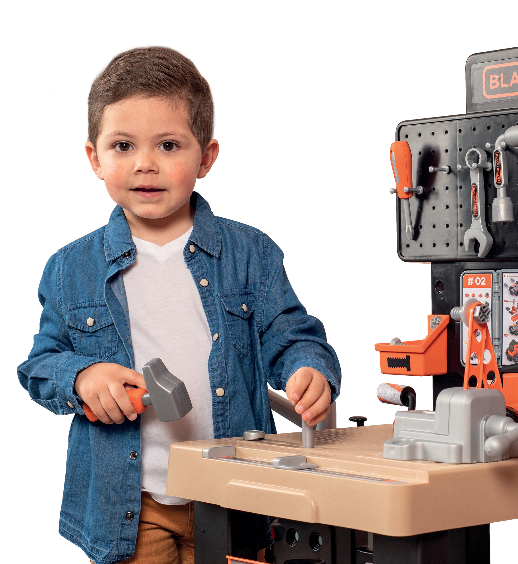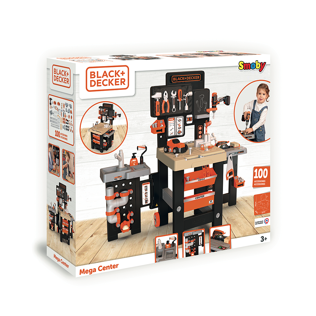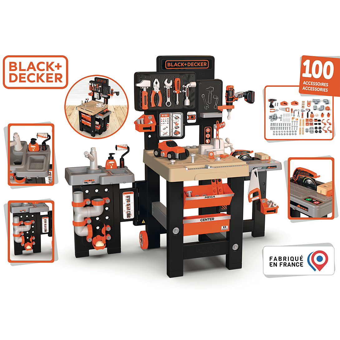 L'atelier Mega Center Black + Decker offre de nombreuses possibilités de jeu et permet de découvrir l'univers de la mécanique, de la plomberie, de la peinture et de la menuiserie. Très complet, il est parfait pour se familiariser avec les gestes de bricolage et imiter papa et maman ! Sur la partie centrale tu pourras y retrouver un établi avec un plateau avec une fonction tape/tape clou, 1 étau, 1 règle mécanique, des espaces de rangement, 1 support pour accrocher les outils, 1 petit tableau pour écrire à la craie, et 1 livret explicatif pour construire des véhicules. Tu pourras également te familiariser avec la peinture grâce à l'évier et au bac à peinture, ainsi qu'avec la plomberie grâce aux tuyaux et aux colliers de fixation que tu pourras assembler pour former un vrai circuit de tuyauterie (circuit à balles). Tu pourras aussi couper du bois grâce à la scie circulaire qui s'actionne en poussant le levier ! De nombreux accessoires sont inclus : 6 outils (scie, marteau, clé plate, tournevis, pinces, clé à pipe), des vis, des écrous, des clous, 1 set de construction pouvant se transformer en nombreux véhicules, 1 perceuse mécanique, 1 rouleau de peinture, et 1 flacon pousse-mousse. Après avoir joué l'ensemble se transporte facilement grâce aux parties latérales pliables et aux roulettes. A partir de 3 ans - Fabrication française.