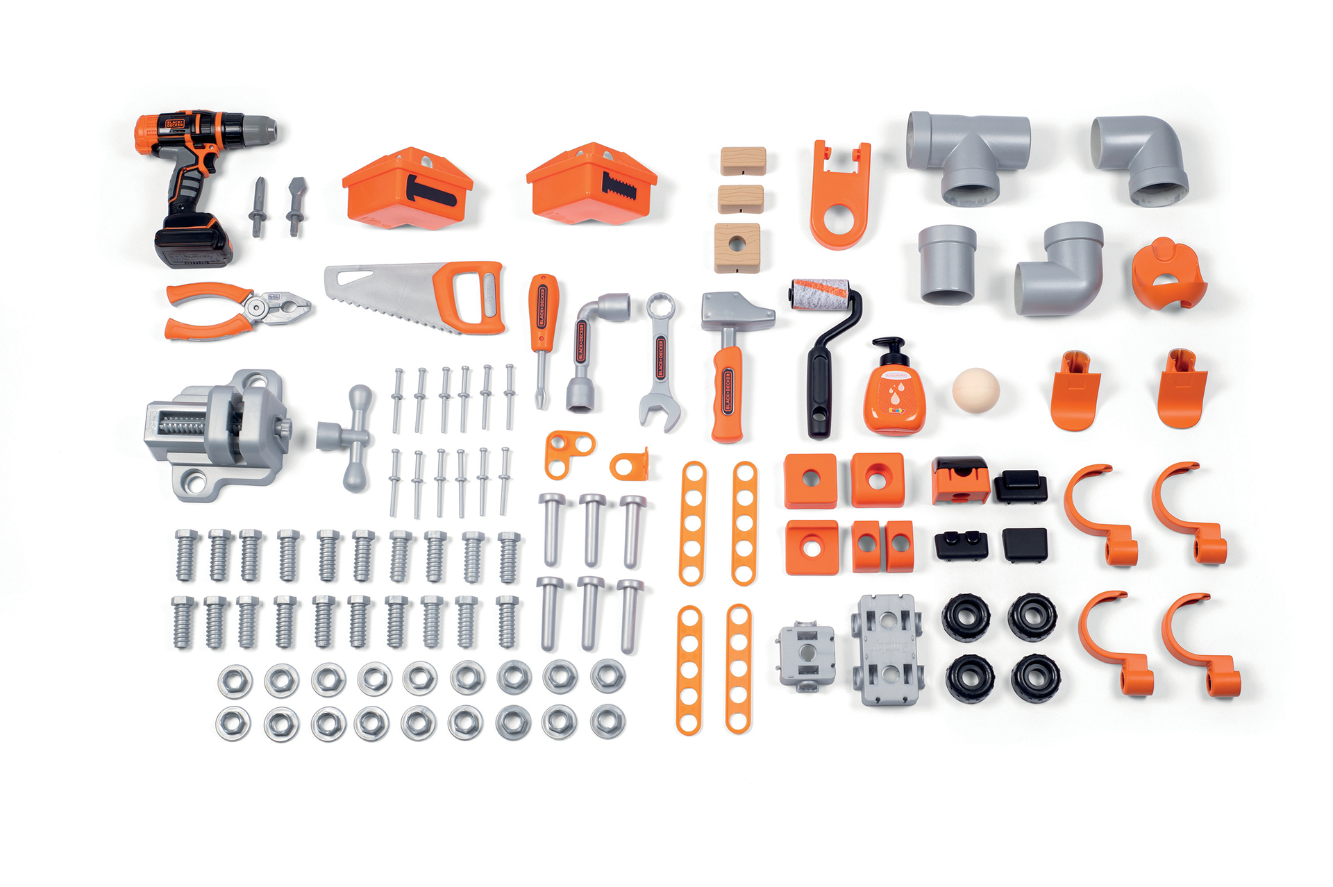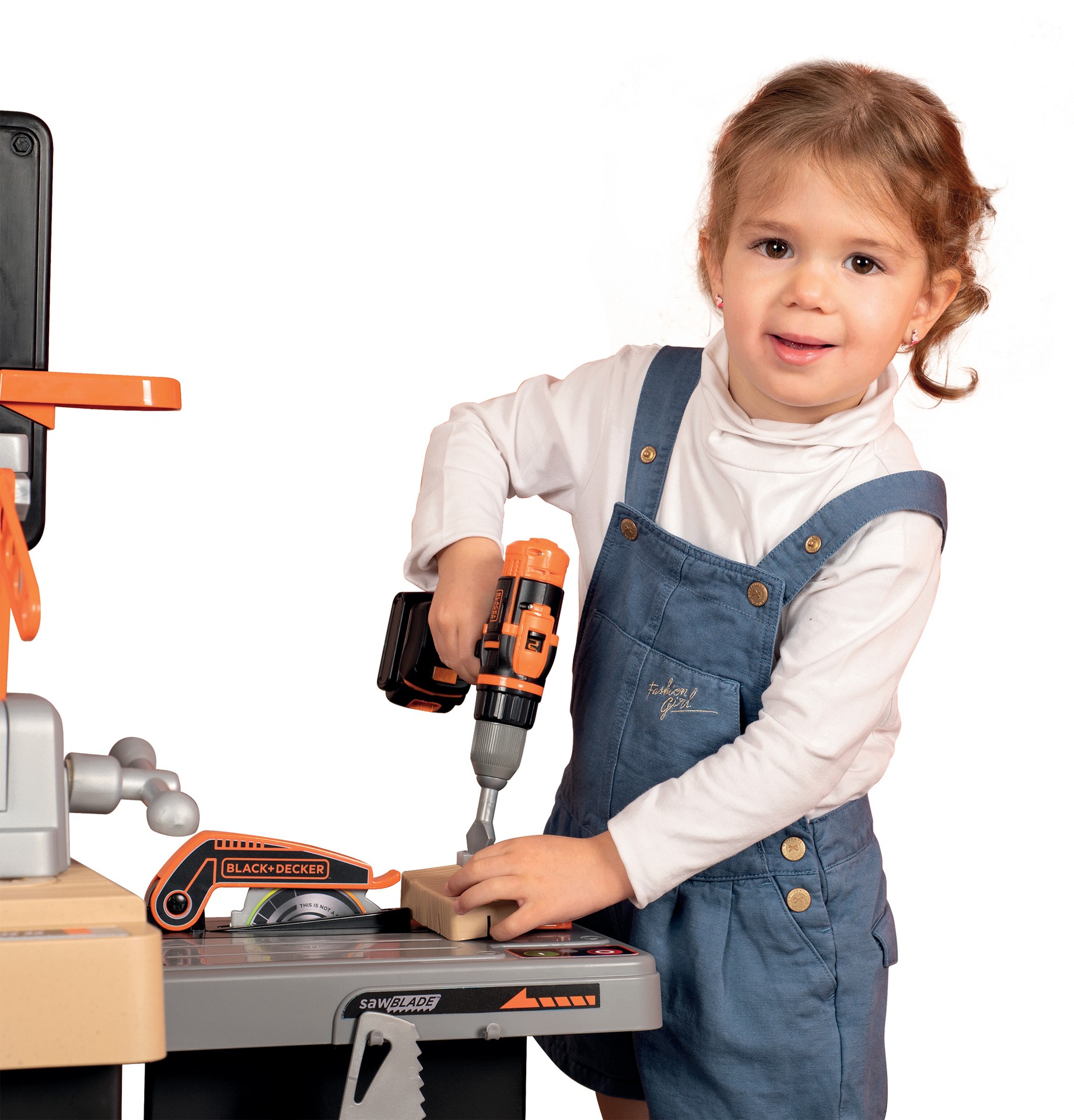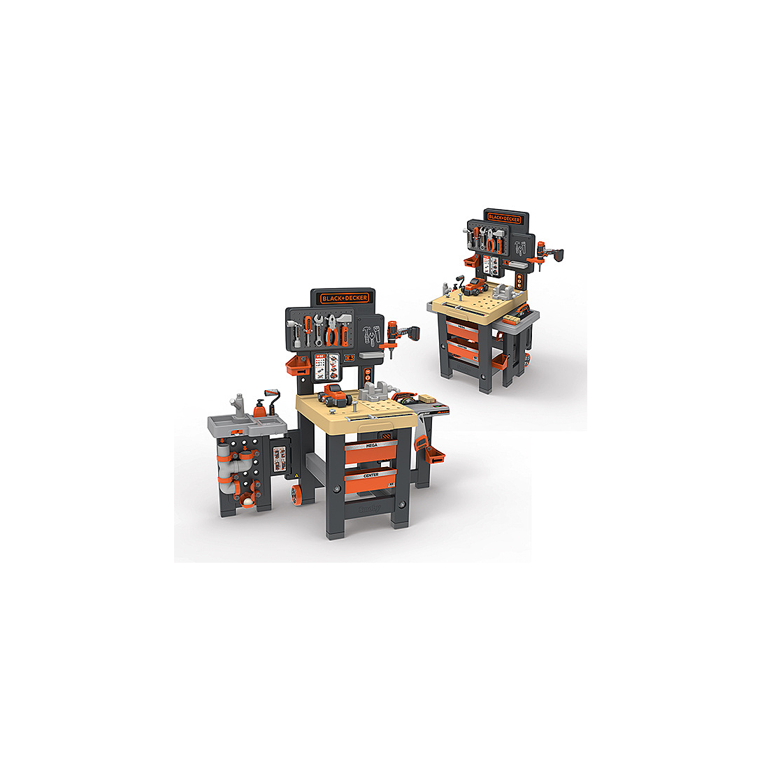 L'atelier Mega Center Black + Decker offre de nombreuses possibilités de jeu et permet de découvrir l'univers de la mécanique, de la plomberie, de la peinture et de la menuiserie. Très complet, il est parfait pour se familiariser avec les gestes de bricolage et imiter papa et maman ! Sur la partie centrale tu pourras y retrouver un établi avec un plateau avec une fonction tape/tape clou, 1 étau, 1 règle mécanique, des espaces de rangement, 1 support pour accrocher les outils, 1 petit tableau pour écrire à la craie, et 1 livret explicatif pour construire des véhicules. Tu pourras également te familiariser avec la peinture grâce à l'évier et au bac à peinture, ainsi qu'avec la plomberie grâce aux tuyaux et aux colliers de fixation que tu pourras assembler pour former un vrai circuit de tuyauterie (circuit à balles). Tu pourras aussi couper du bois grâce à la scie circulaire qui s'actionne en poussant le levier ! De nombreux accessoires sont inclus : 6 outils (scie, marteau, clé plate, tournevis, pinces, clé à pipe), des vis, des écrous, des clous, 1 set de construction pouvant se transformer en nombreux véhicules, 1 perceuse mécanique, 1 rouleau de peinture, et 1 flacon pousse-mousse. Après avoir joué l'ensemble se transporte facilement grâce aux parties latérales pliables et aux roulettes. A partir de 3 ans - Fabrication française.