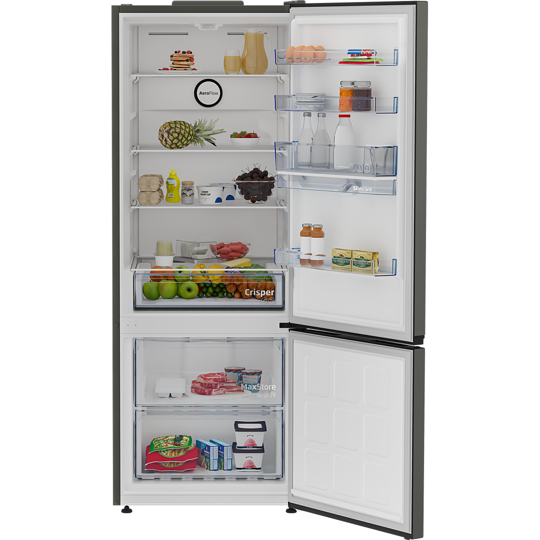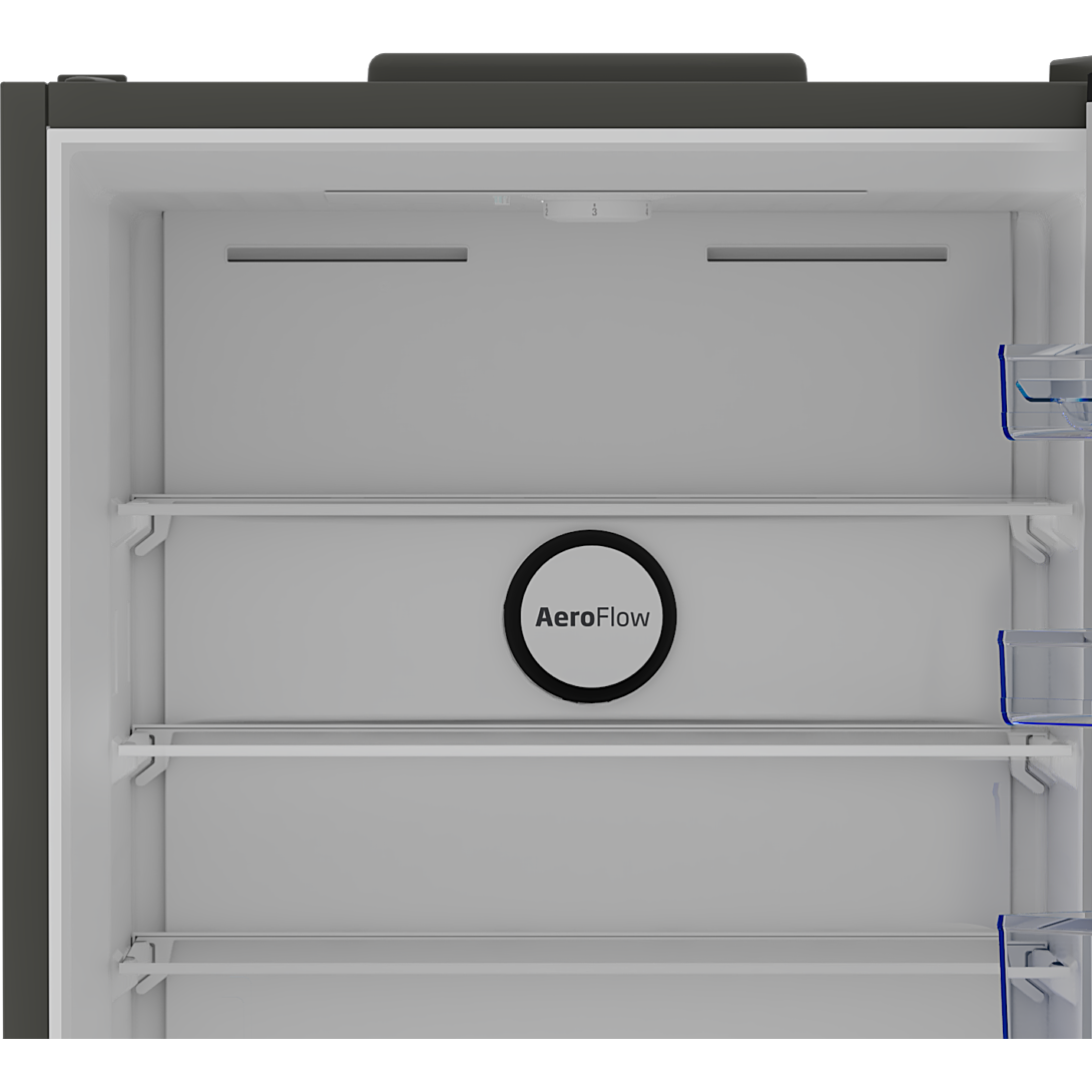 Réfrigérateur | Pose libre | Combiné | Froid ventilé | Technologie de froid : Aeroflow | Ventilateur réfrigérateur | Volume total (litres) : 475 | Volume net du réfrigérateur (litres) : 340 | Volume net du congélateur (litres) : 135 | Classe d'efficacité énergétique : E | Niveau sonore dB(A) : 36 | Type de contrôle : Mécanique | Distributeur d'eau : Sur réservoir d'eau malin | Type de fabrique de glaçons : Bac à glaçons avec couvercle | Type de poignée : Intégrée avec finition métal | Dimensions (HxLxP) en cm | 187.0 | 70.0 | 74.5 | Manhattan Grey